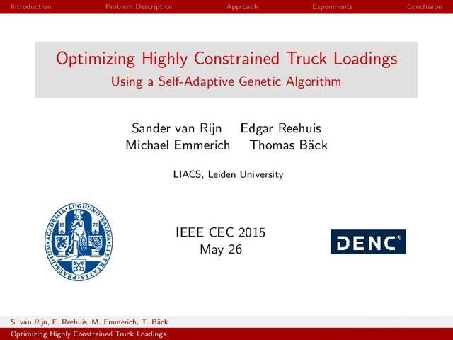 Loadings Using a Self-Adaptive Genetic Algorithm Sander van Rijn Edgar Reehuis Michael Emmerich Thomas B¨ ack LIACS, Leiden University IEEE CEC 2015 May 26 S. van Rijn, E. Reehuis, M. Emmerich, T. B¨ ack LIACS, Leiden University Optimizing Highly Constrained Truck Loadings