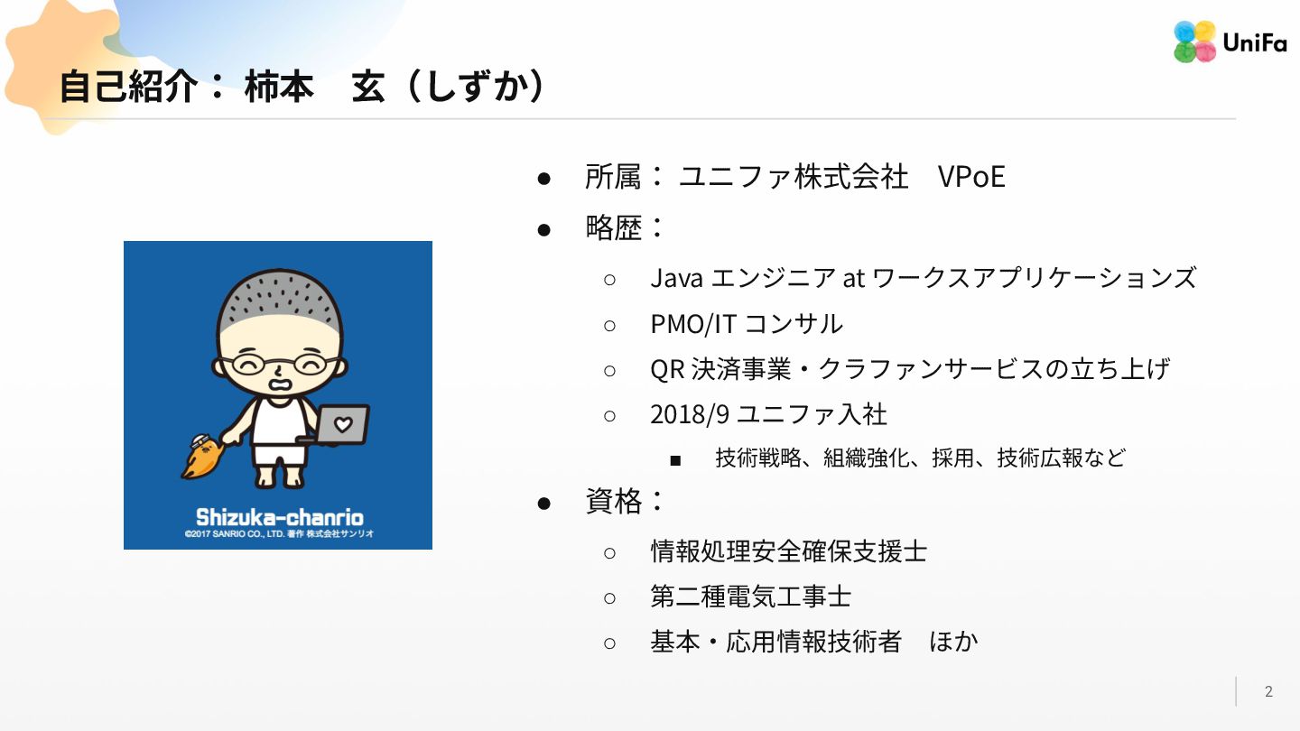 エンジニア at ワークスアプリケーションズ ◦ PMO/IT コンサル ◦ QR 決済事業‧クラファンサービスの⽴ち上げ ◦ 2018/9 ユニファ⼊社 ▪ 技術戦略、組織強化、採⽤、技術広報など • 資格: ◦ 情報処理安全確保⽀援⼠ ◦ 第⼆種電気⼯事⼠ ◦ 基本‧応⽤情報技術者 ほか