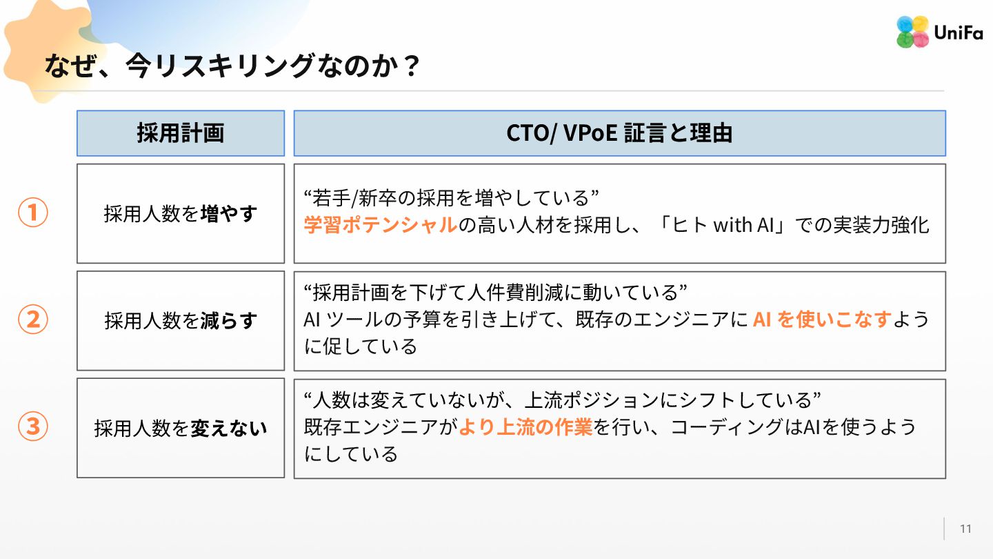 10 なぜ、今リスキリングなのか? ① ② ③ 出展: 「2025年9⽉版 企業のAI活⽤状況と、エンジニア転職に与える影響」フィンディ株式会社 https://findy-code.io/blog/ai_report_202509/
