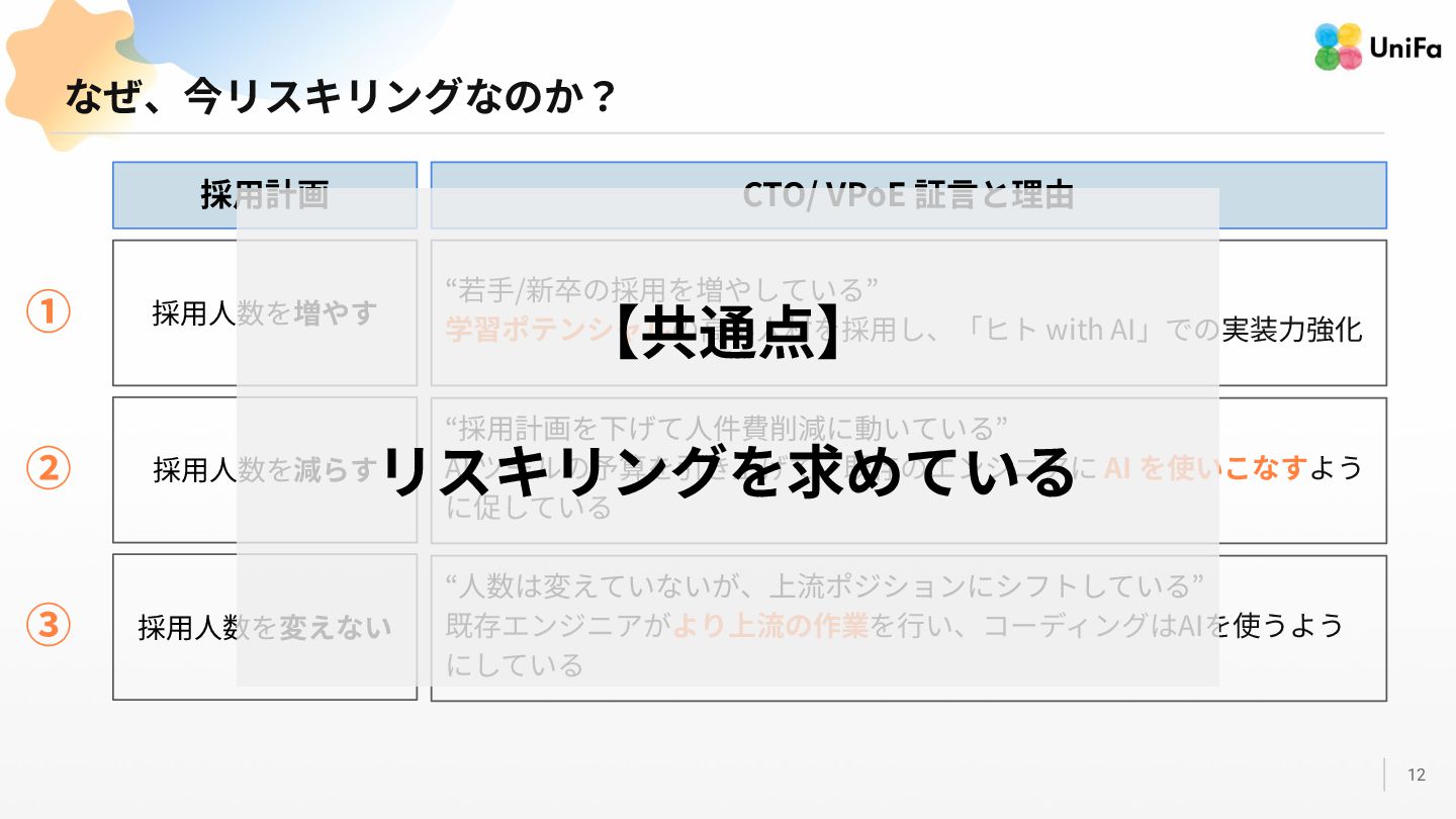 11 なぜ、今リスキリングなのか? ① ② ③ 採⽤計画 CTO/ VPoE 証⾔と理由 採⽤⼈数を増やす