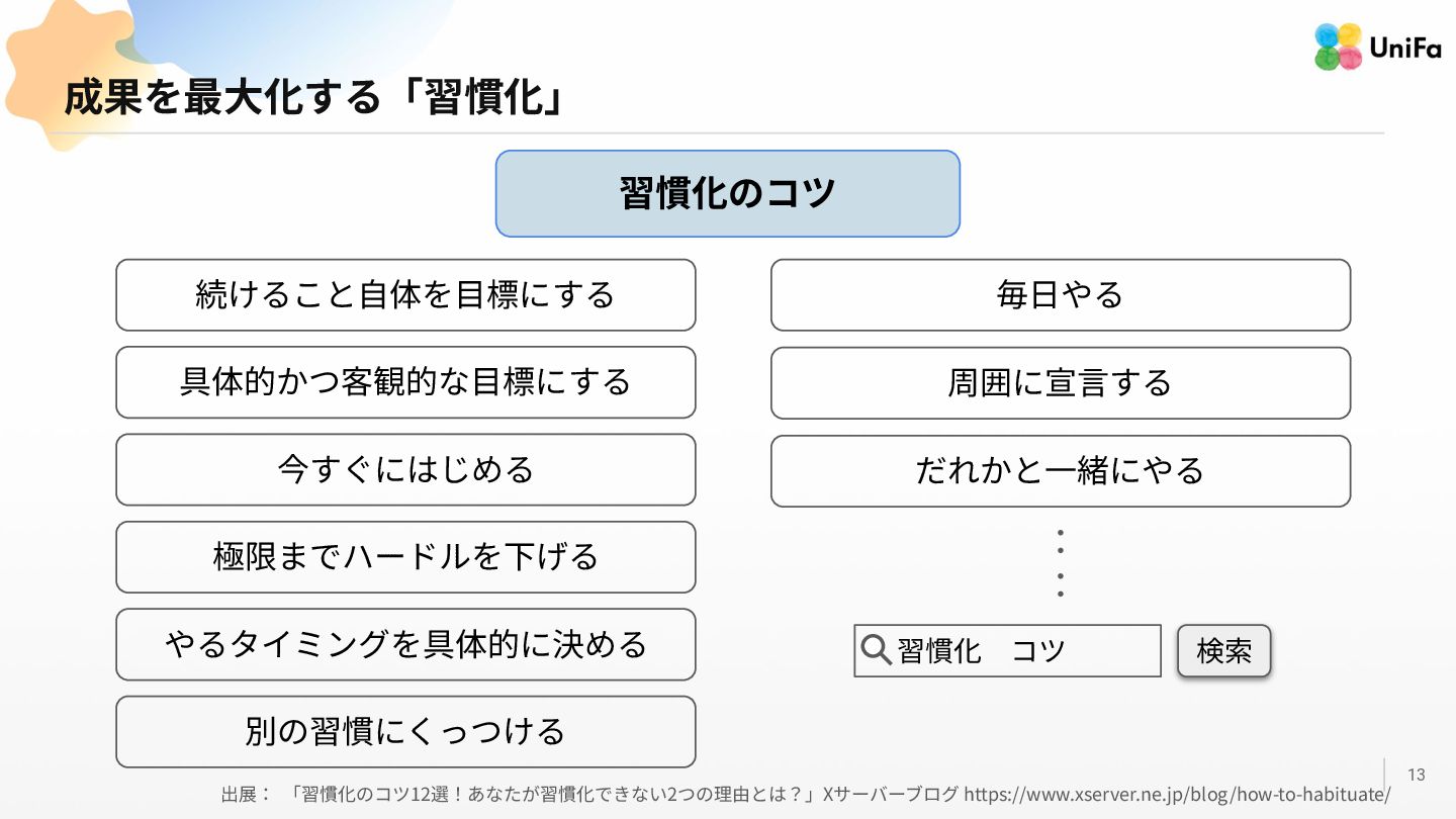 毎⽇やる 周囲に宣⾔する : : 習慣化 コツ 検索 出展: 「習慣化のコツ12選!あなたが習慣化できない2つの理由とは?」Xサーバーブログ https://www.xserver.ne.jp/blog/how-to-habituate/