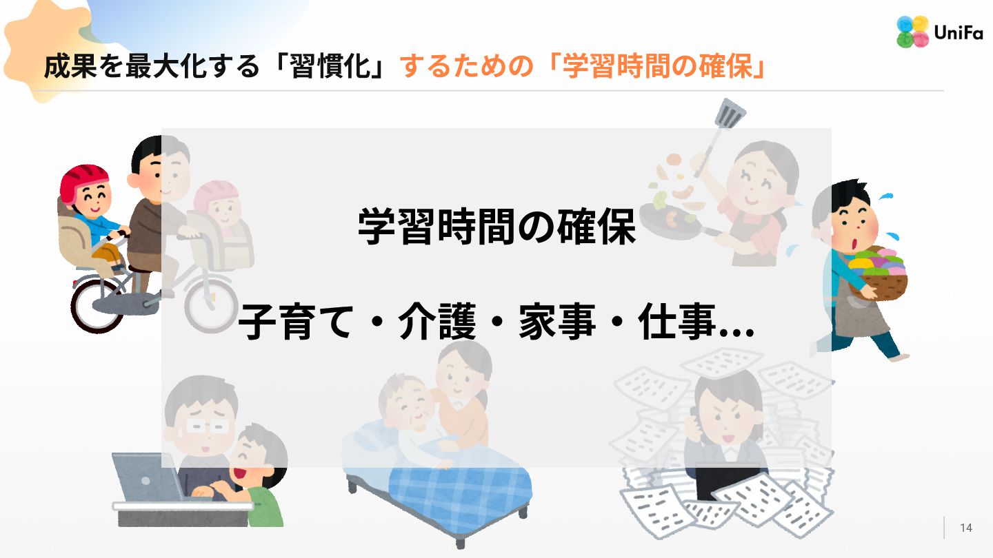 14 成果を最⼤化する「習慣化」するための「学習時間の確保」 学習時間の確保 ⼦育て‧介護‧家事‧仕事...