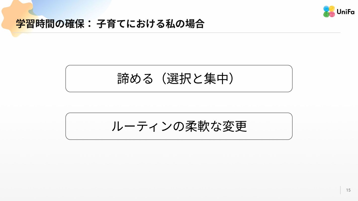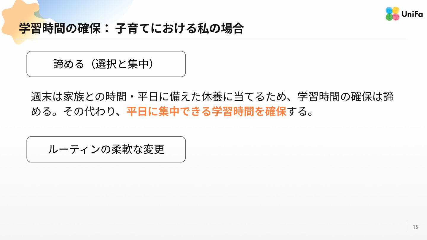 15 学習時間の確保: ⼦育てにおける私の場合 諦める(選択と集中) ルーティンの柔軟な変更