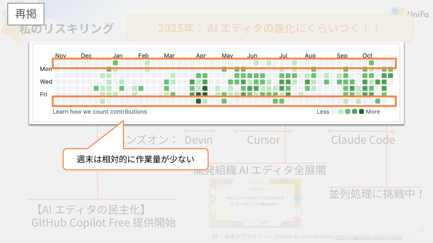 提供開始 開発組織 AI エディタ全展開 並列処理に挑戦中! ハンズオン: Devin Cursor Claude Code 図: 柿本のプライベート GitHub の contributions https://github.com/xiz-kak 再掲 週末は相対的に作業量が少ない