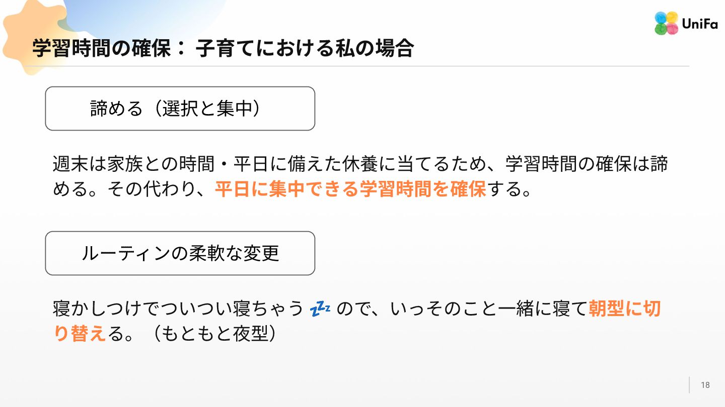 16 学習時間の確保: ⼦育てにおける私の場合 諦める(選択と集中) ルーティンの柔軟な変更 週末は家族との時間‧平⽇に備えた休養に当てるため、学習時間の確保は諦 める。その代わり、平⽇に集中できる学習時間を確保する。