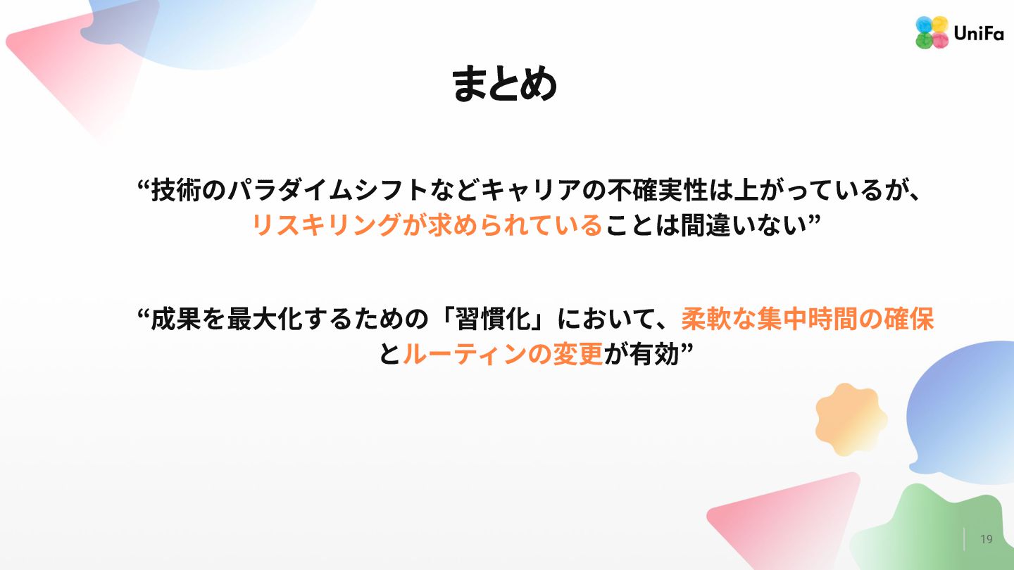19 “技術のパラダイムシフトなどキャリアの不確実性は上がっているが、 リスキリングが求められていることは間違いない” まとめ “成果を最⼤化するための「習慣化」において、柔軟な集中時間の確保 とルーティンの変更が有効”