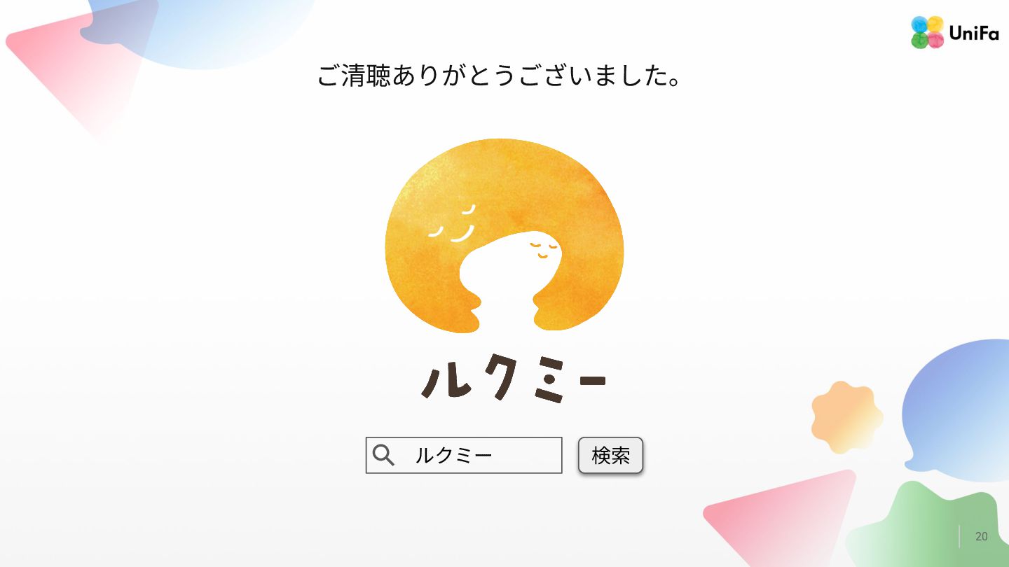 20 ご清聴ありがとうございました。 ルクミー 検索