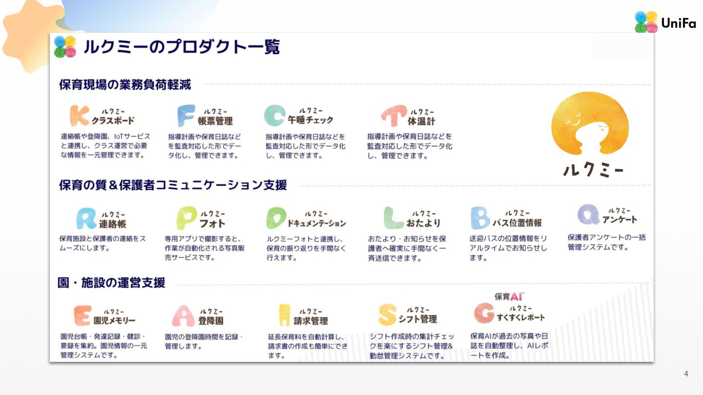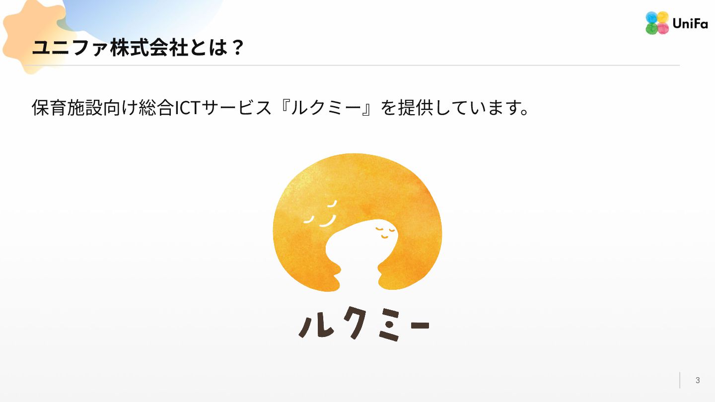 3 ユニファ株式会社とは? 保育施設向け総合ICTサービス『ルクミー』を提供しています。