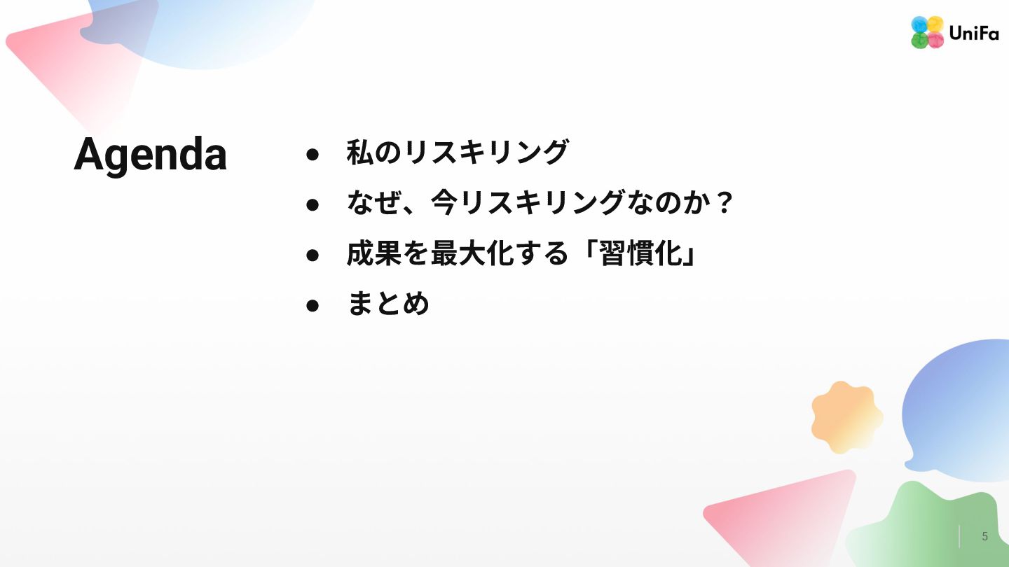 Agenda 5 • 私のリスキリング • なぜ、今リスキリングなのか? • 成果を最⼤化する「習慣化」 • まとめ