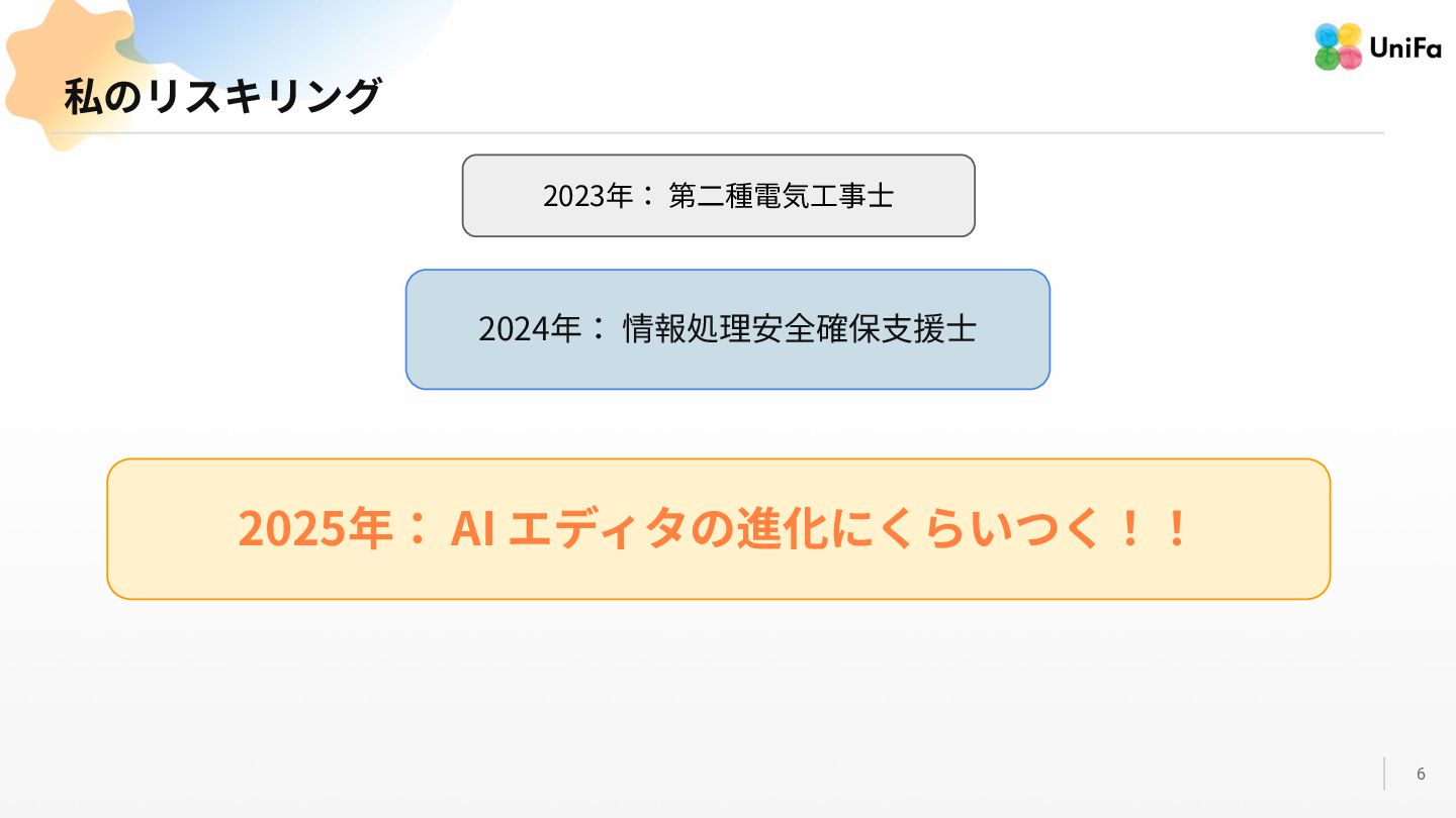 6 私のリスキリング 2023年: 第⼆種電気⼯事⼠ 2024年: 情報処理安全確保⽀援⼠ 2025年: AI エディタの進化にくらいつく!!