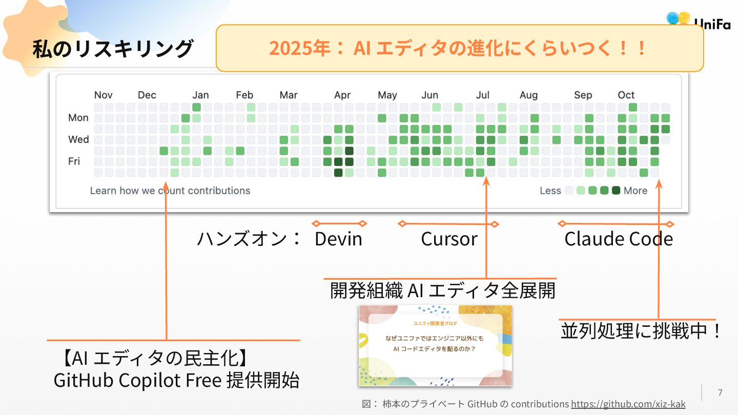 提供開始 開発組織 AI エディタ全展開 並列処理に挑戦中! ハンズオン: Devin Cursor Claude Code 図: 柿本のプライベート GitHub の contributions https://github.com/xiz-kak