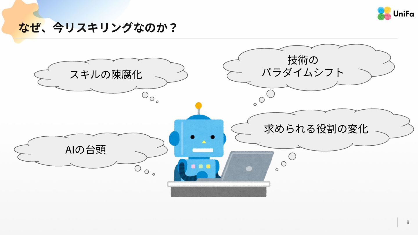 8 なぜ、今リスキリングなのか? 技術の パラダイムシフト スキルの陳腐化 求められる役割の変化 AIの台頭
