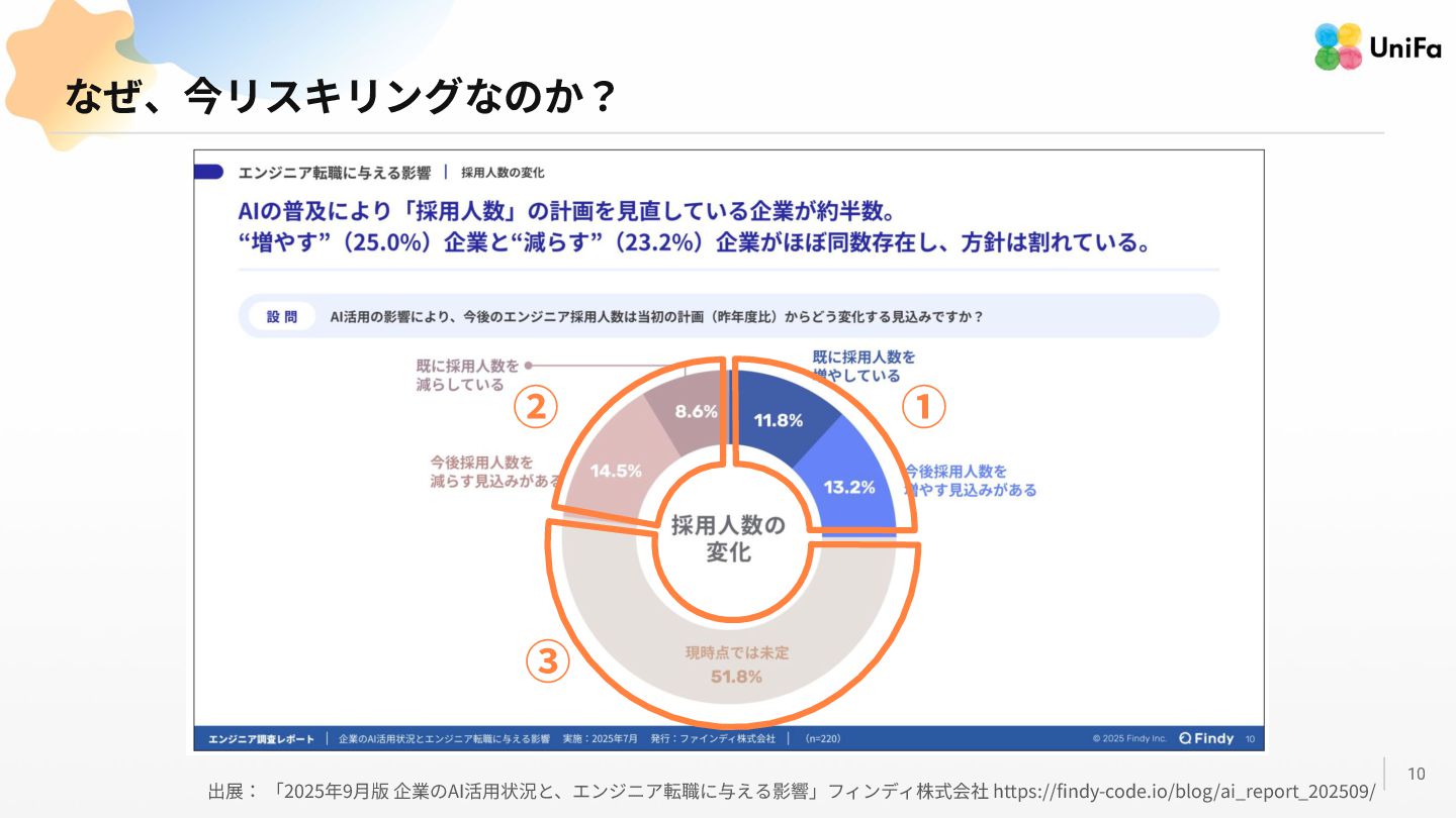 9 なぜ、今リスキリングなのか? 出展: 「2025年9⽉版 企業のAI活⽤状況と、エンジニア転職に与える影響」フィンディ株式会社 https://findy-code.io/blog/ai_report_202509/