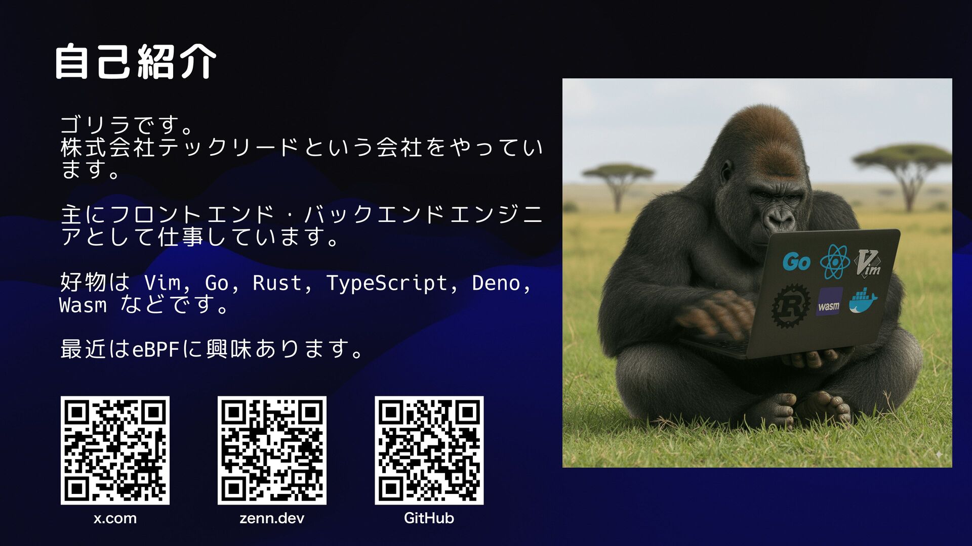 自己紹介 ゴリラです。 株式会社テックリードという会社をやってい ます。 主にフロントエンド・バックエンドエンジニ アとして仕事しています。 好物は Vim, Go, Rust,