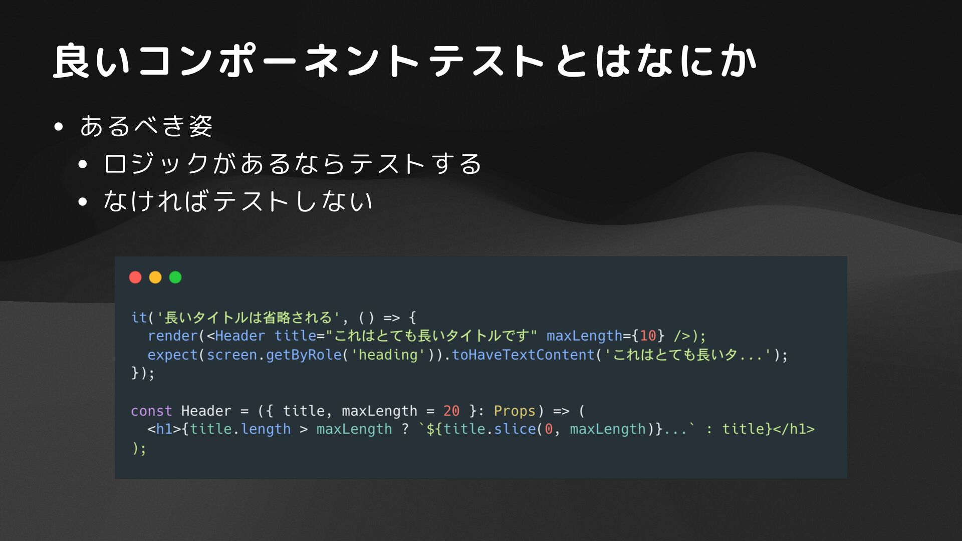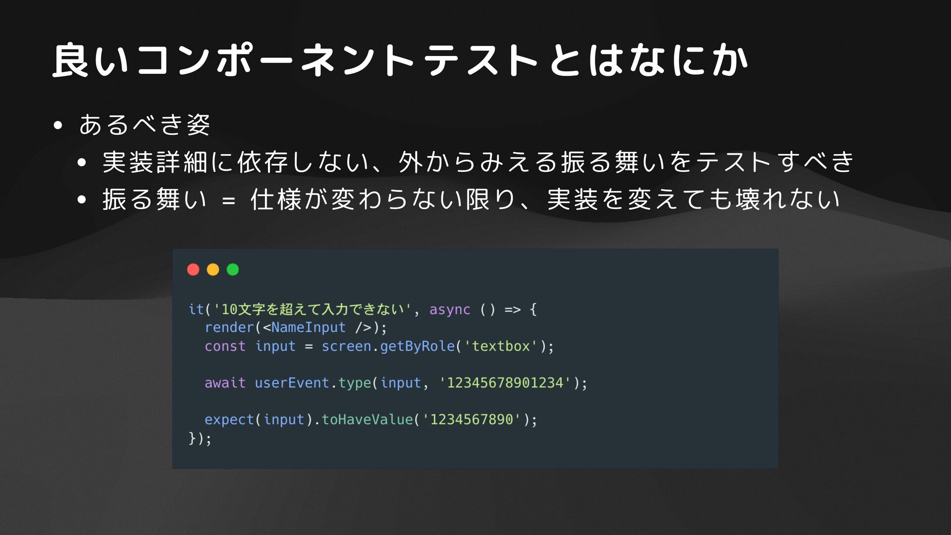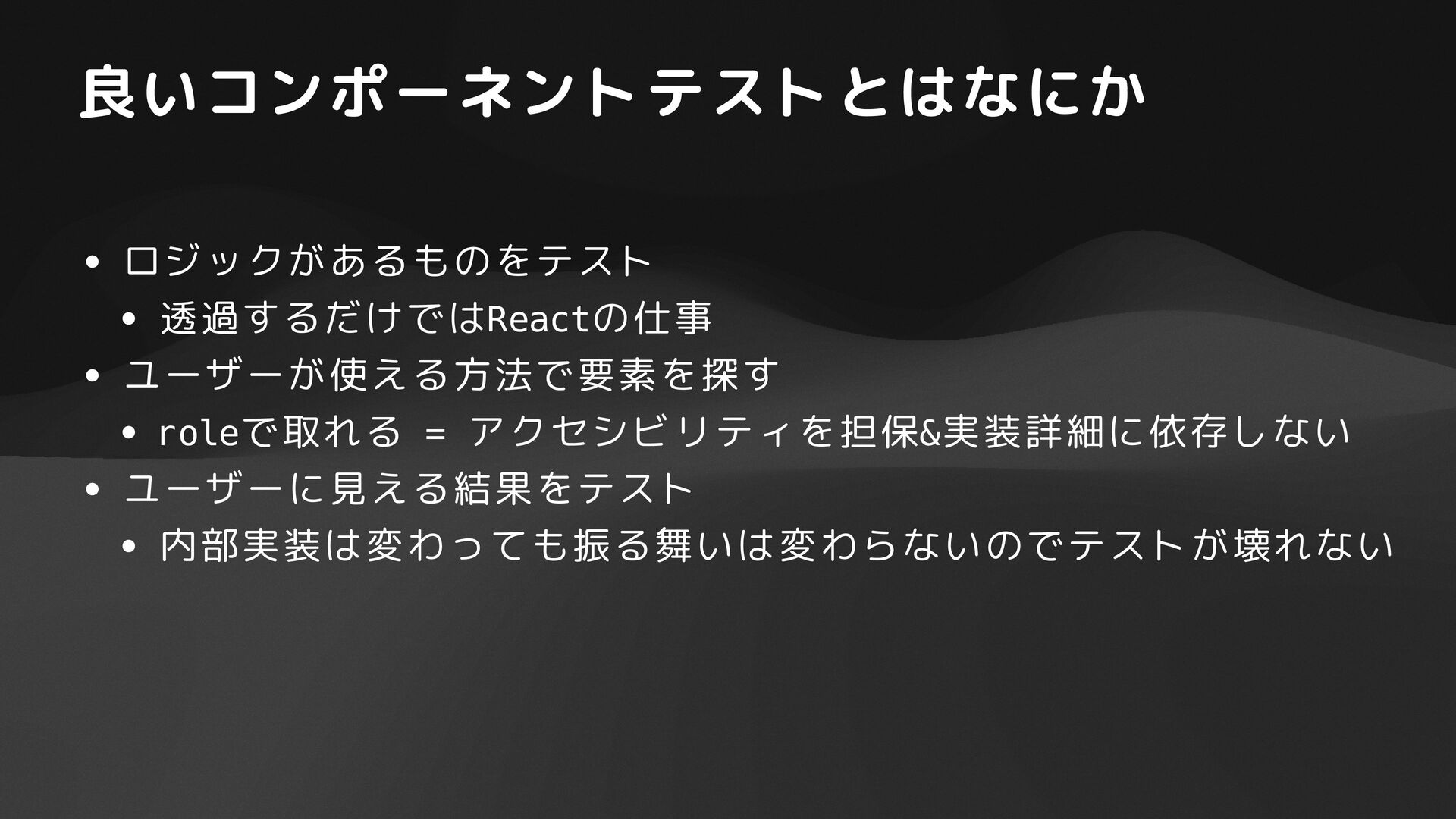 • ユーザーに見える結果をテスト • 内部実装は変わっても振る舞いは変わらないのでテストが壊れない 良いコンポーネントテストとはなにか