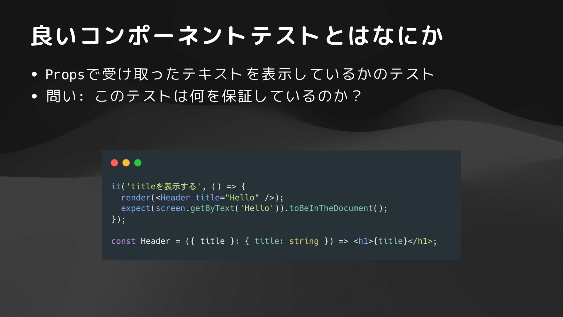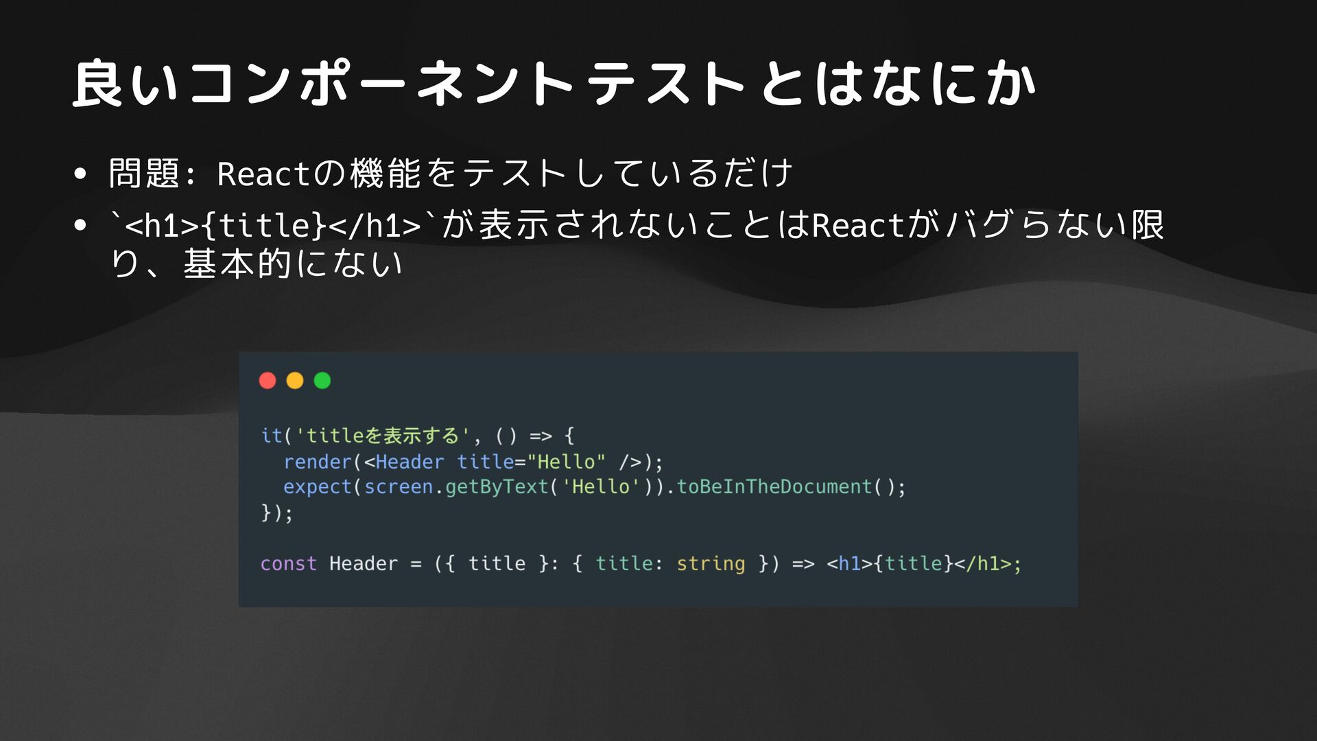 • 問題: Reactの機能をテストしているだけ • `<h1>{title}</h1>`が表示されないことはReactがバグらない限 り、基本的にない 良いコンポーネントテストとはなにか