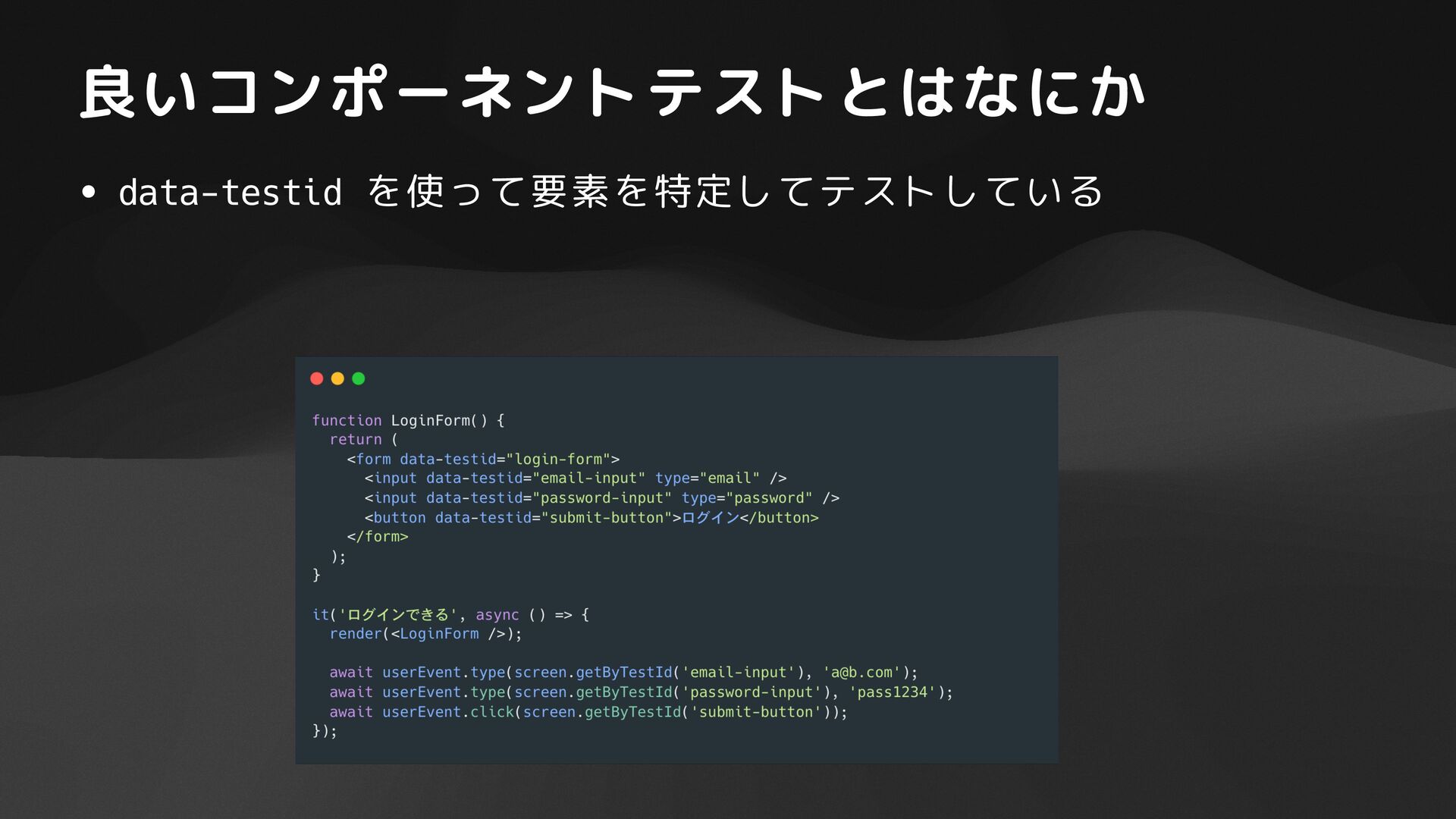• data-testid を使って要素を特定してテストしている 良いコンポーネントテストとはなにか