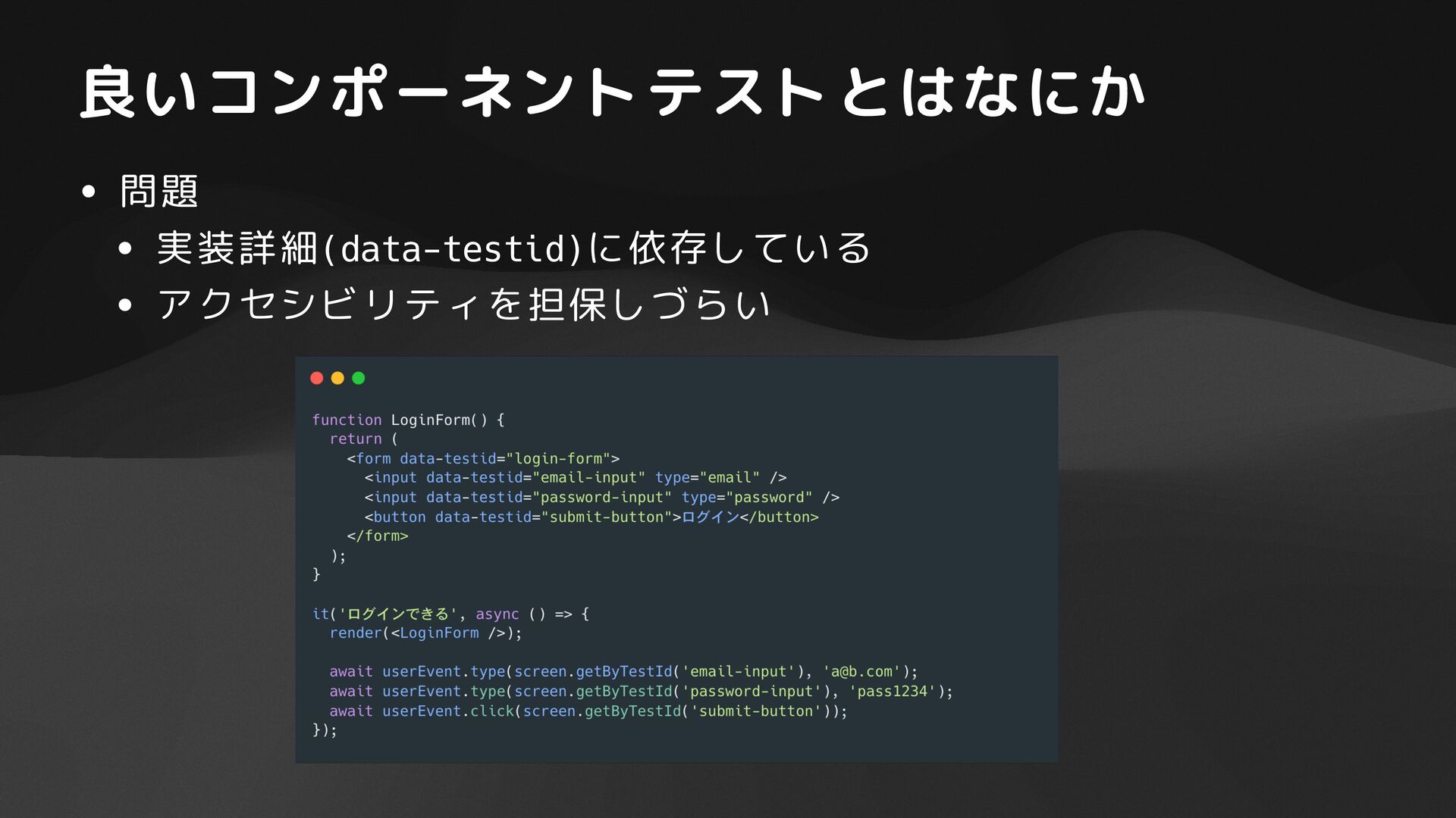 • 問題 • 実装詳細(data-testid)に依存している • アクセシビリティを担保しづらい 良いコンポーネントテストとはなにか