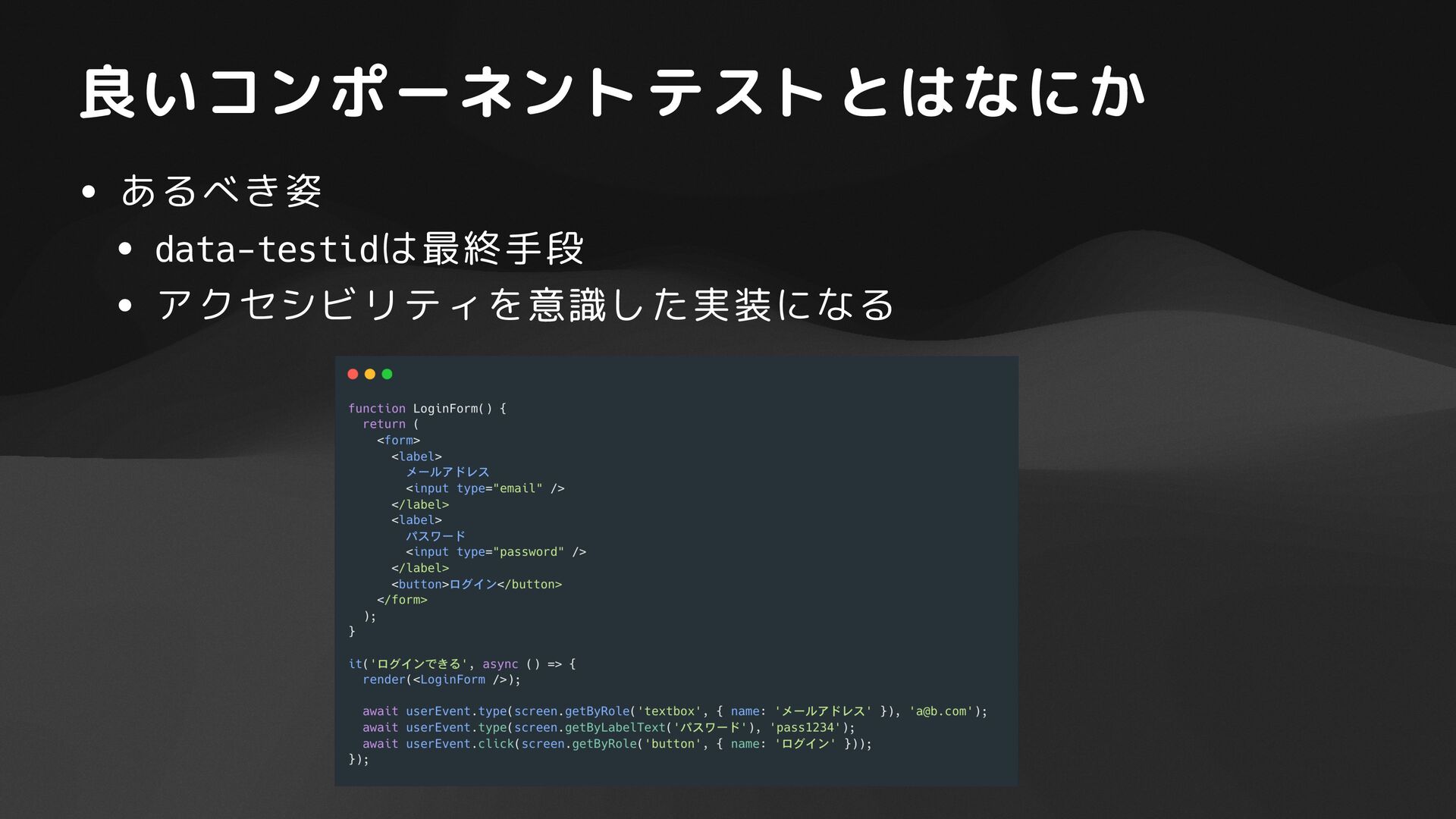• あるべき姿 • data-testidは最終手段 • アクセシビリティを意識した実装になる 良いコンポーネントテストとはなにか