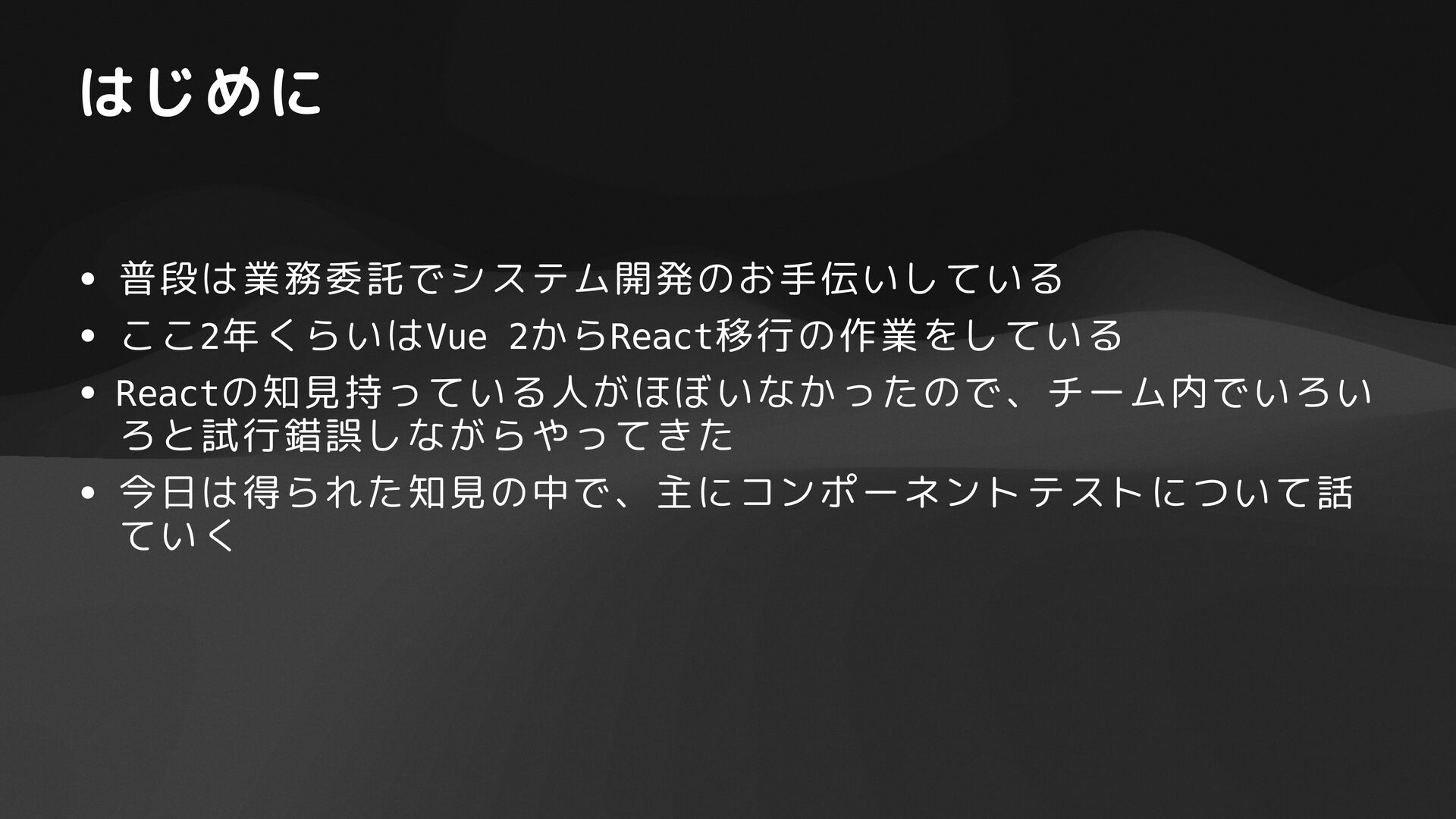 はじめに • 普段は業務委託でシステム開発のお手伝いしている • ここ2年くらいはVue 2からReact移行の作業をしている • Reactの知見持っている人がほぼいなかったので、チーム内でいろい ろと試行錯誤しながらやってきた •