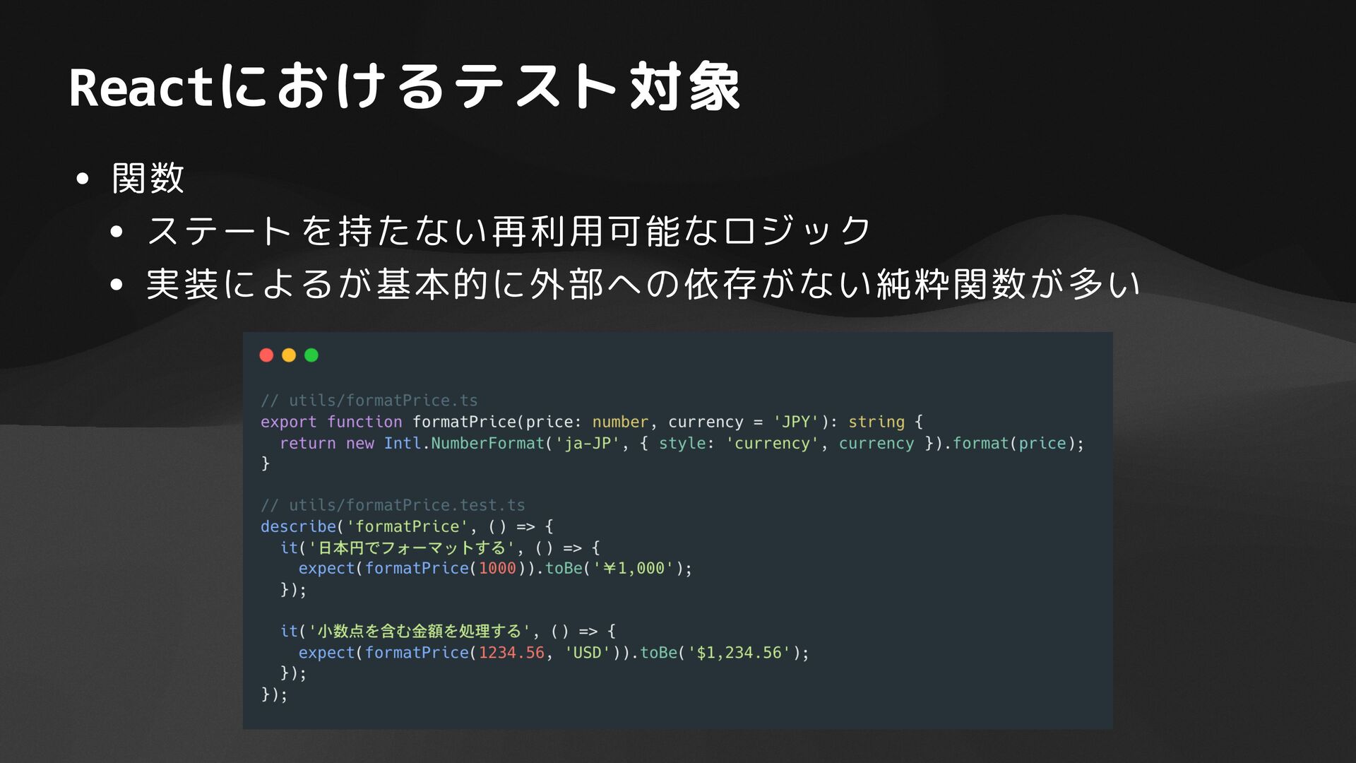 Reactにおけるテスト対象 • 関数 • ステートを持たない再利用可能なロジック • 実装によるが基本的に外部への依存がない純粋関数が多い
