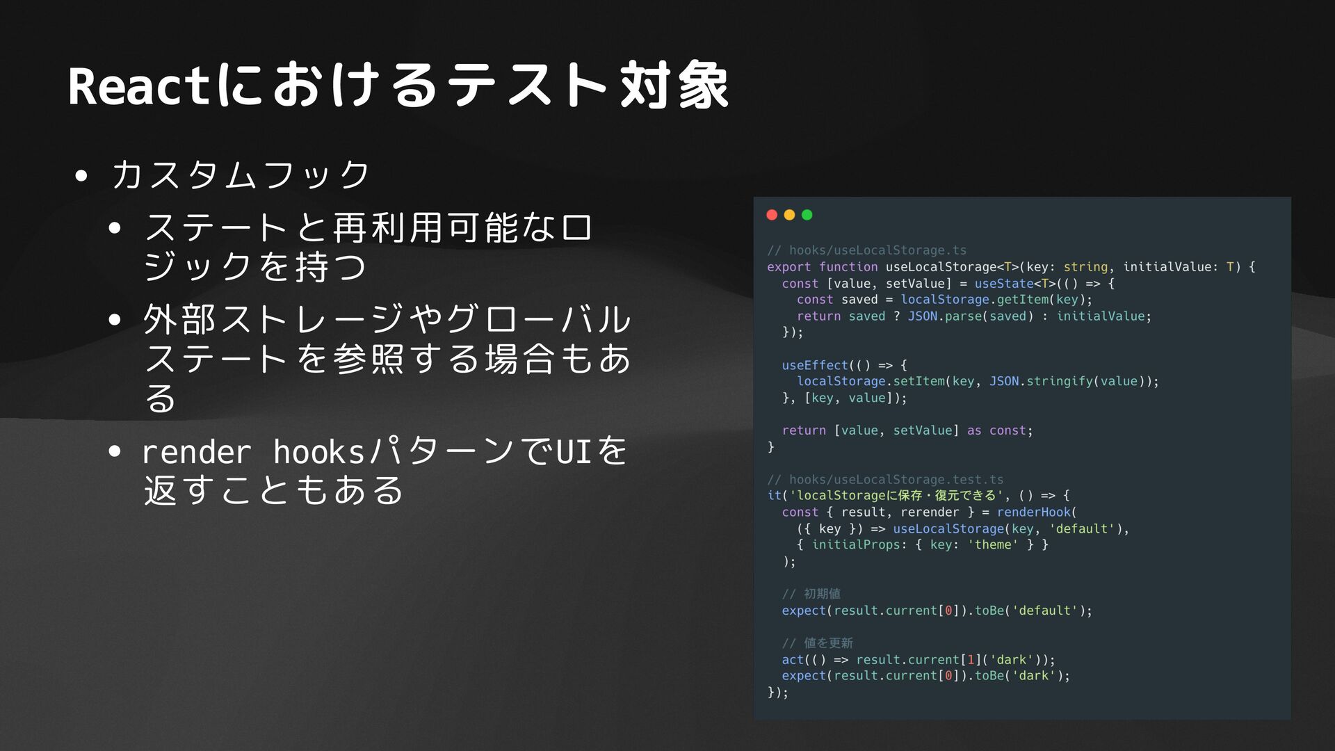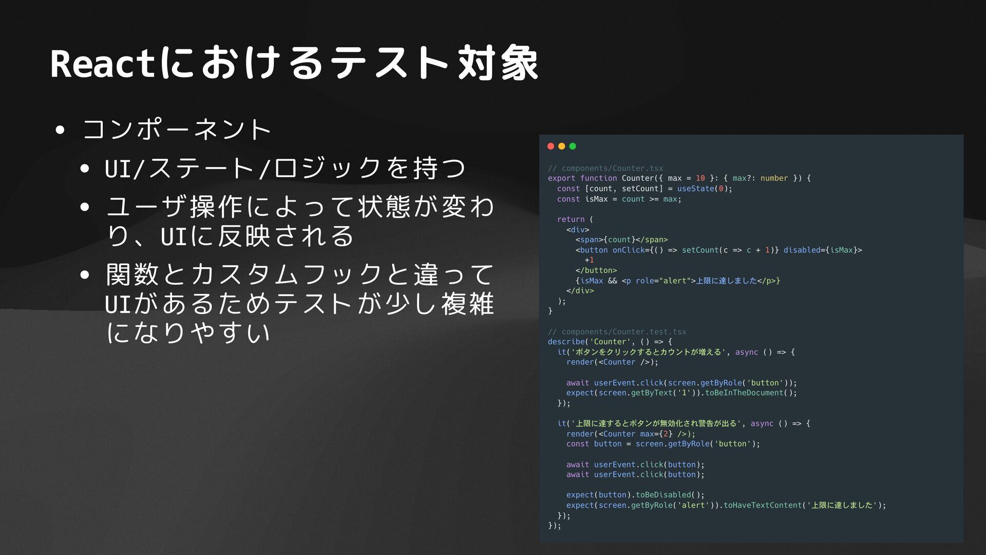 • コンポーネント • UI/ステート/ロジックを持つ • ユーザ操作によって状態が変わ り、UIに反映される • 関数とカスタムフックと違って UIがあるためテストが少し複雑