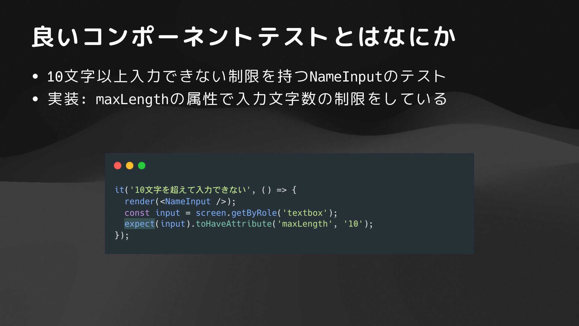 • 10文字以上入力できない制限を持つNameInputのテスト • 実装: maxLengthの属性で入力文字数の制限をしている 良いコンポーネントテストとはなにか
