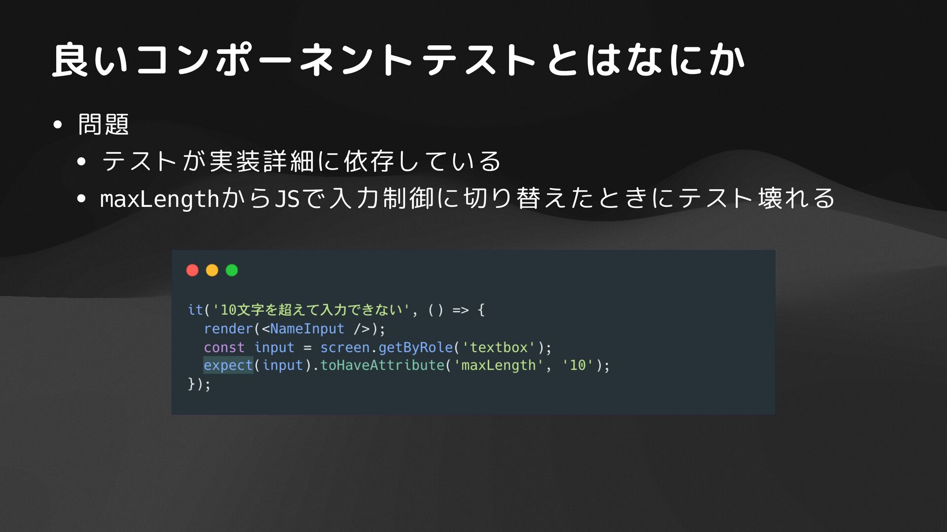 • 問題 • テストが実装詳細に依存している • maxLengthからJSで入力制御に切り替えたときにテスト壊れる 良いコンポーネントテストとはなにか