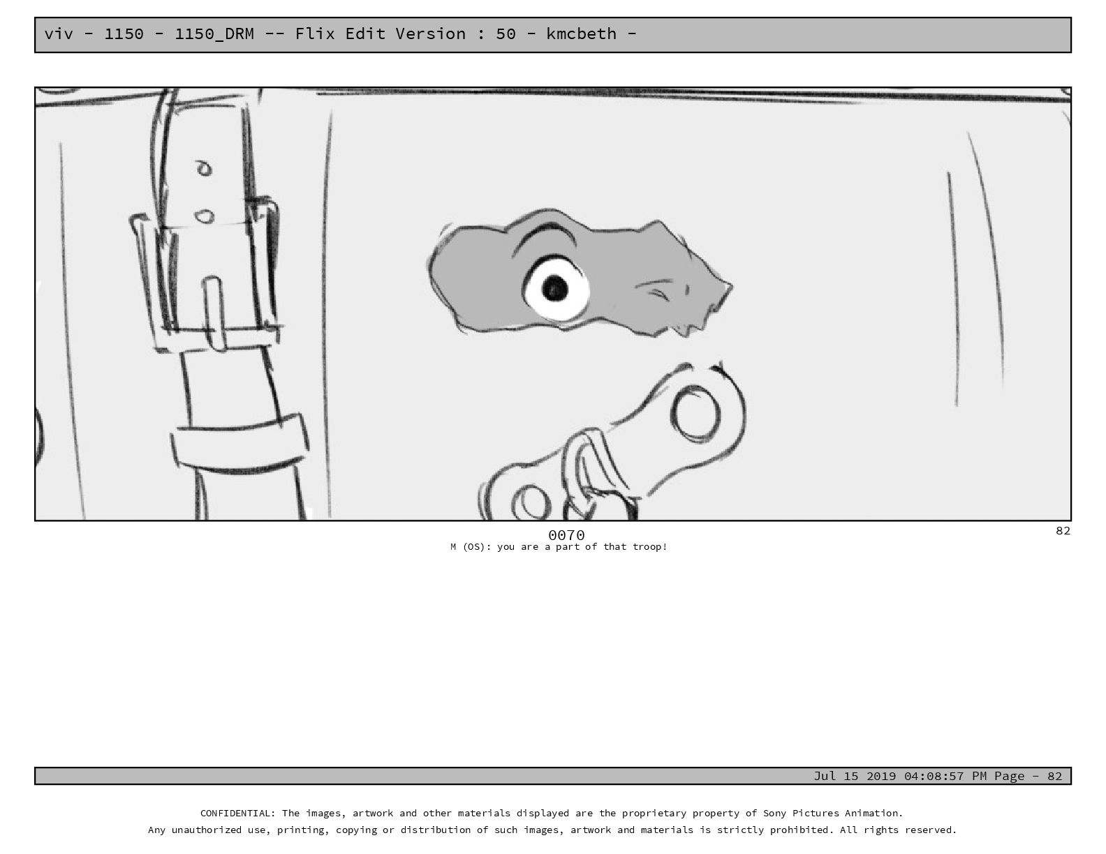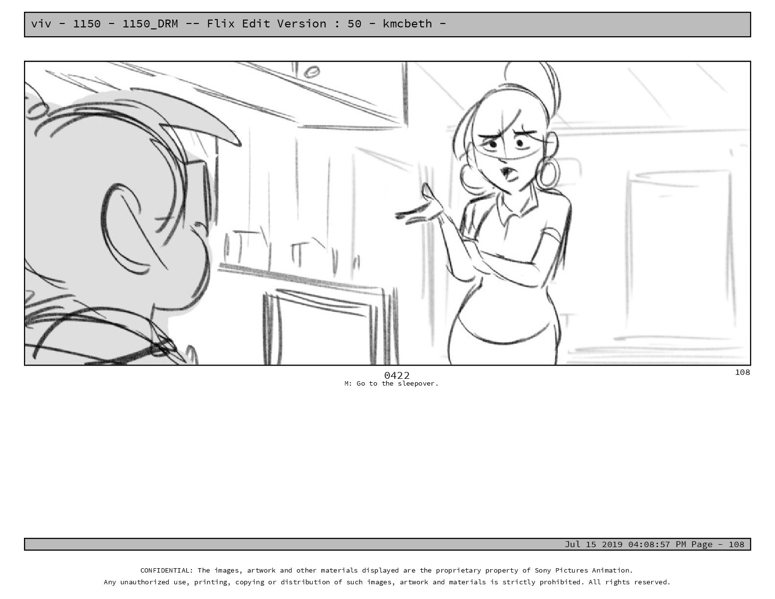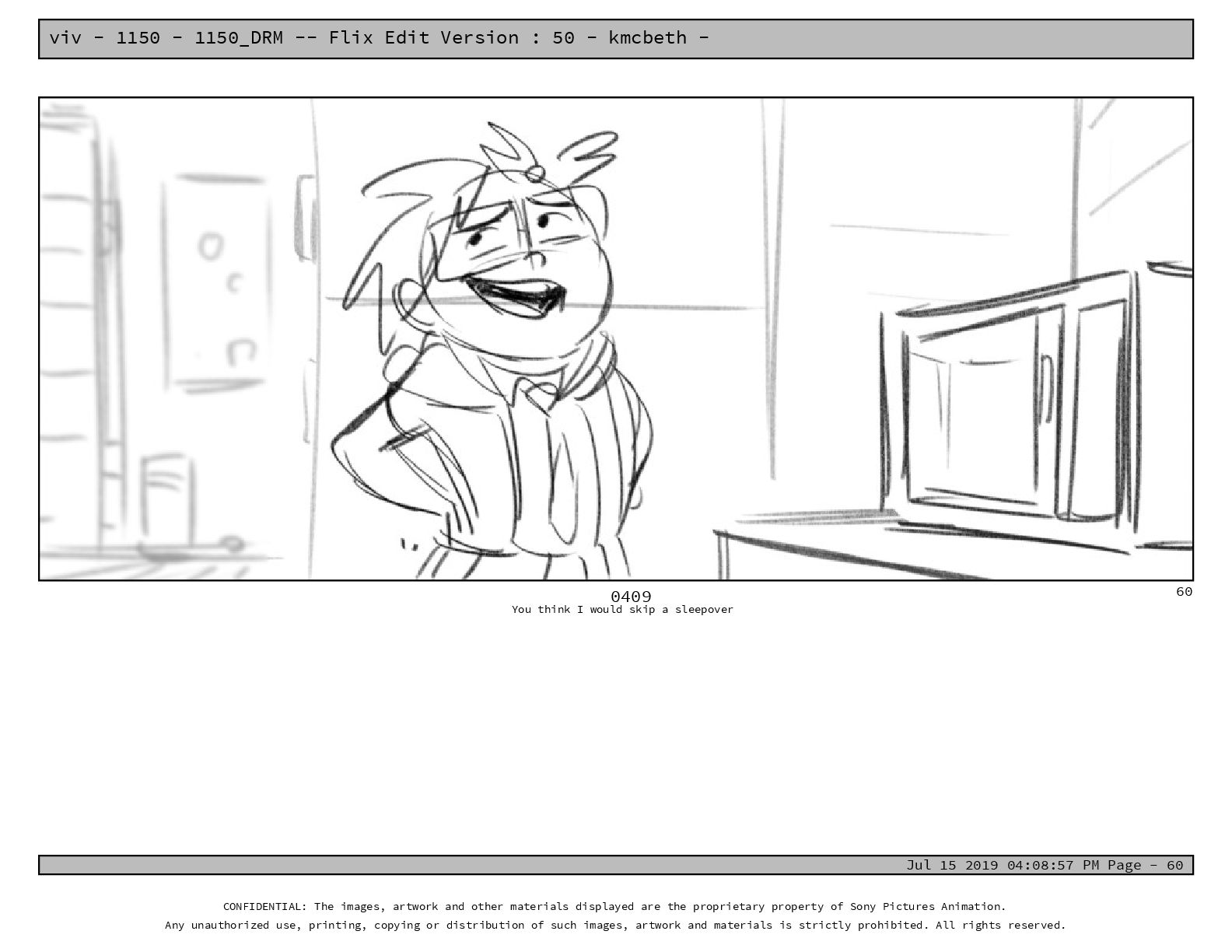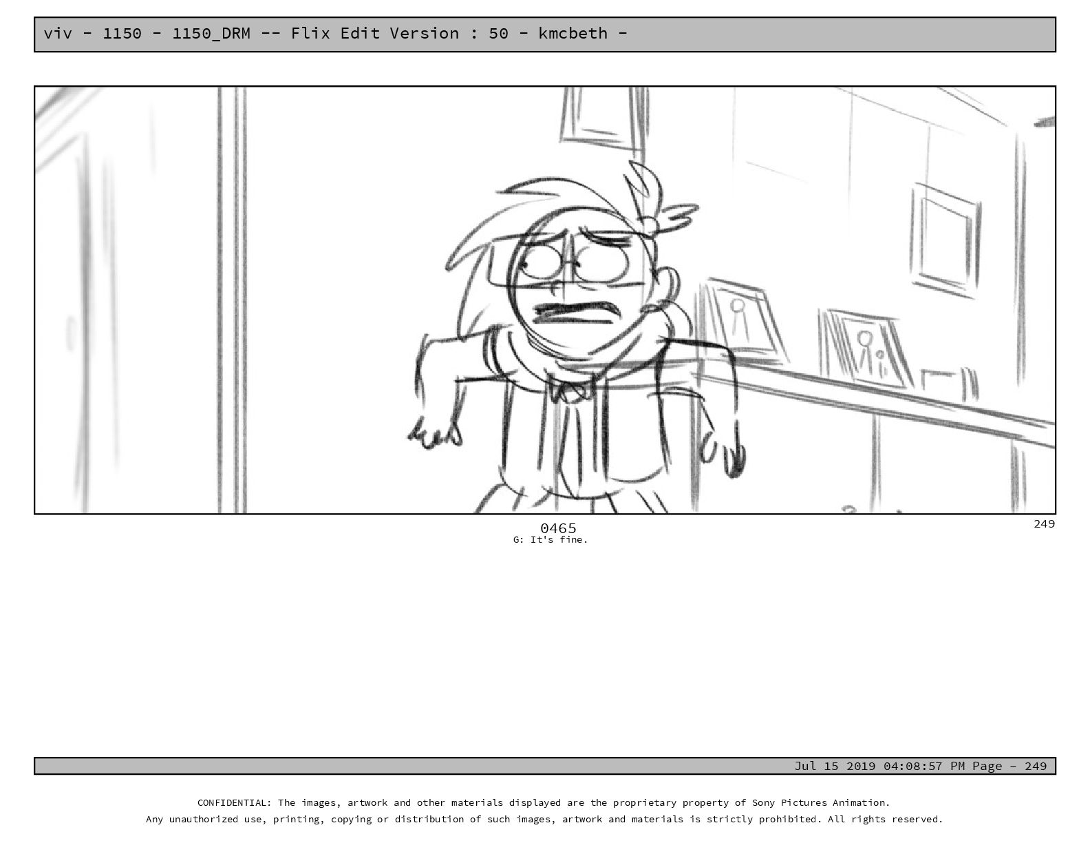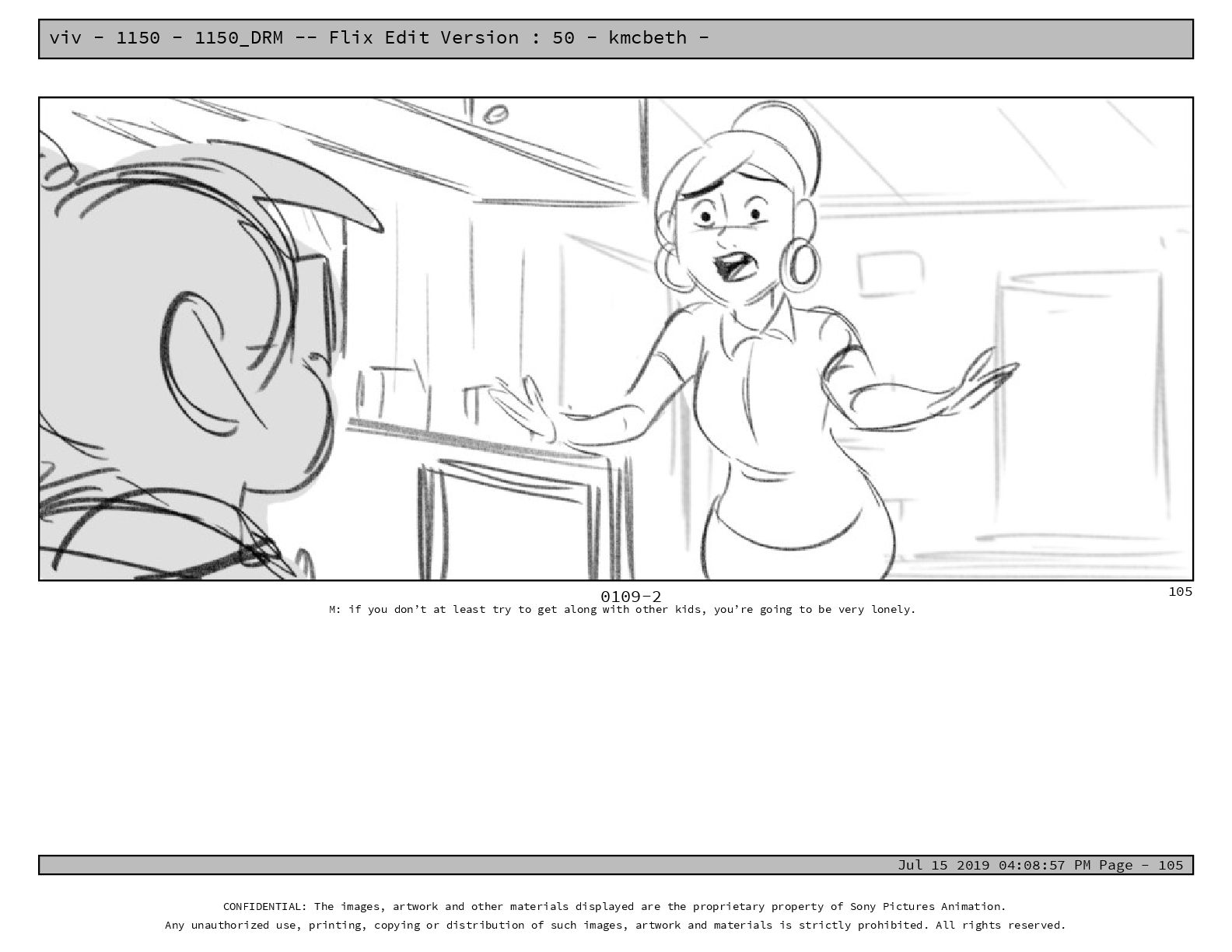 50 - kmcbeth - Jul 15 2019 04:08:57 PM Page - 105 CONFIDENTIAL: The images, artwork and other materials displayed are the proprietary property of Sony Pictures Animation. Any unauthorized use, printing, copying or distribution of such images, artwork and materials is strictly prohibited. All rights reserved. 0109-2 M: if you don’t at least try to get along with other kids, you’re going to be very lonely. 105