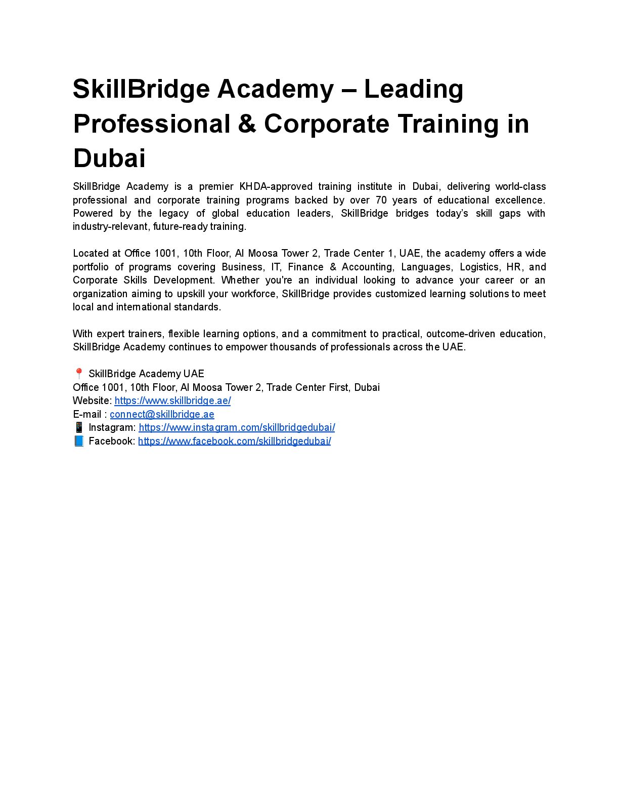 SkillBridge Academy is a premier KHDA-approved training institute in Dubai, delivering world-class professional and corporate training programs backed by over 70 years of educational excellence. Powered by the legacy of global education leaders, SkillBridge bridges today’s skill gaps with industry-relevant, future-ready training. Located at Office 1001, 10th Floor, Al Moosa Tower 2, Trade Center 1, UAE, the academy offers a wide portfolio of programs covering Business, IT, Finance & Accounting, Languages, Logistics, HR, and Corporate Skills Development. Whether you're an individual looking to advance your career or an organization aiming to upskill your workforce, SkillBridge provides customized learning solutions to meet local and international standards. With expert trainers, flexible learning options, and a commitment to practical, outcome-driven education, SkillBridge Academy continues to empower thousands of professionals across the UAE. 📍 SkillBridge Academy UAE Office 1001, 10th Floor, Al Moosa Tower 2, Trade Center First, Dubai Website: https://www.skillbridge.ae/ E-mail :