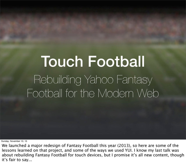 Sunday, November 10, 13 We launched a major redesign of Fantasy Football this year (2013), so here are some of the lessons learned on that project, and some of the ways we used YUI. I know my last talk was about rebuilding Fantasy Football for touch devices, but I promise it’s all new content, though it’s fair to say...