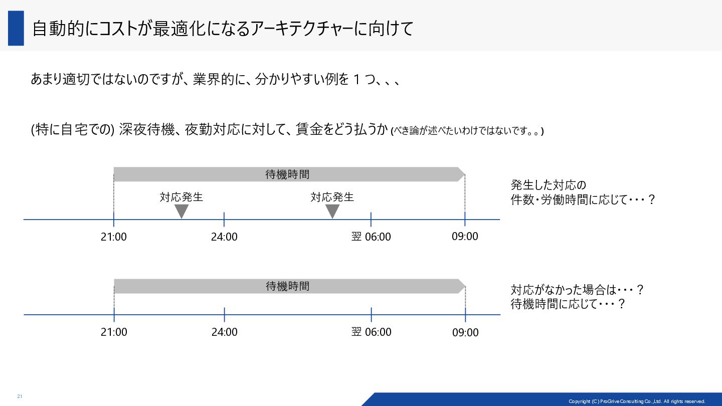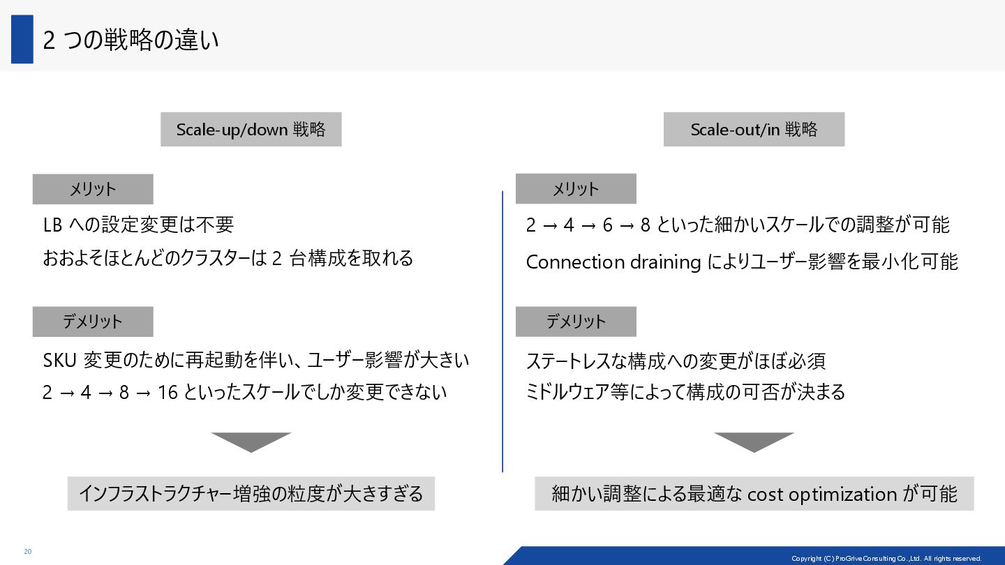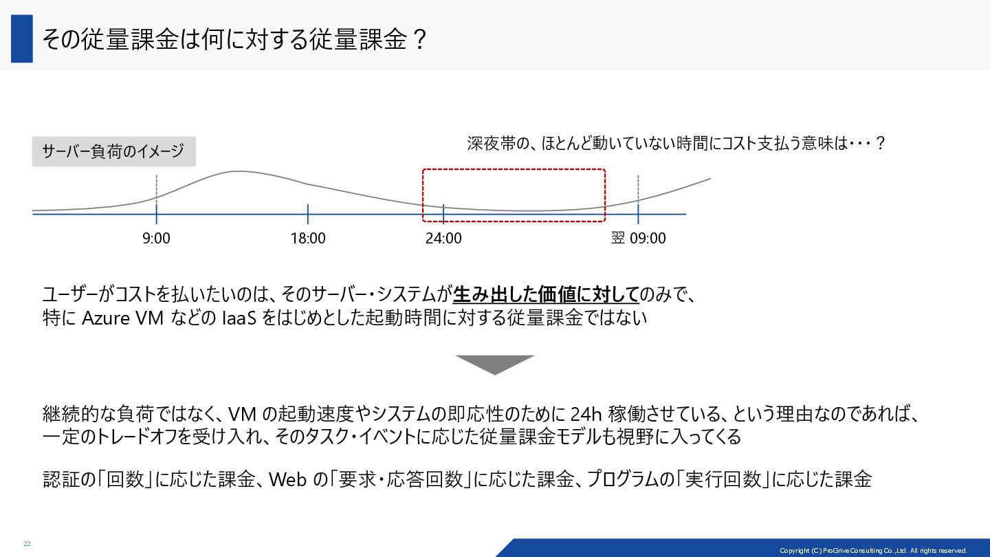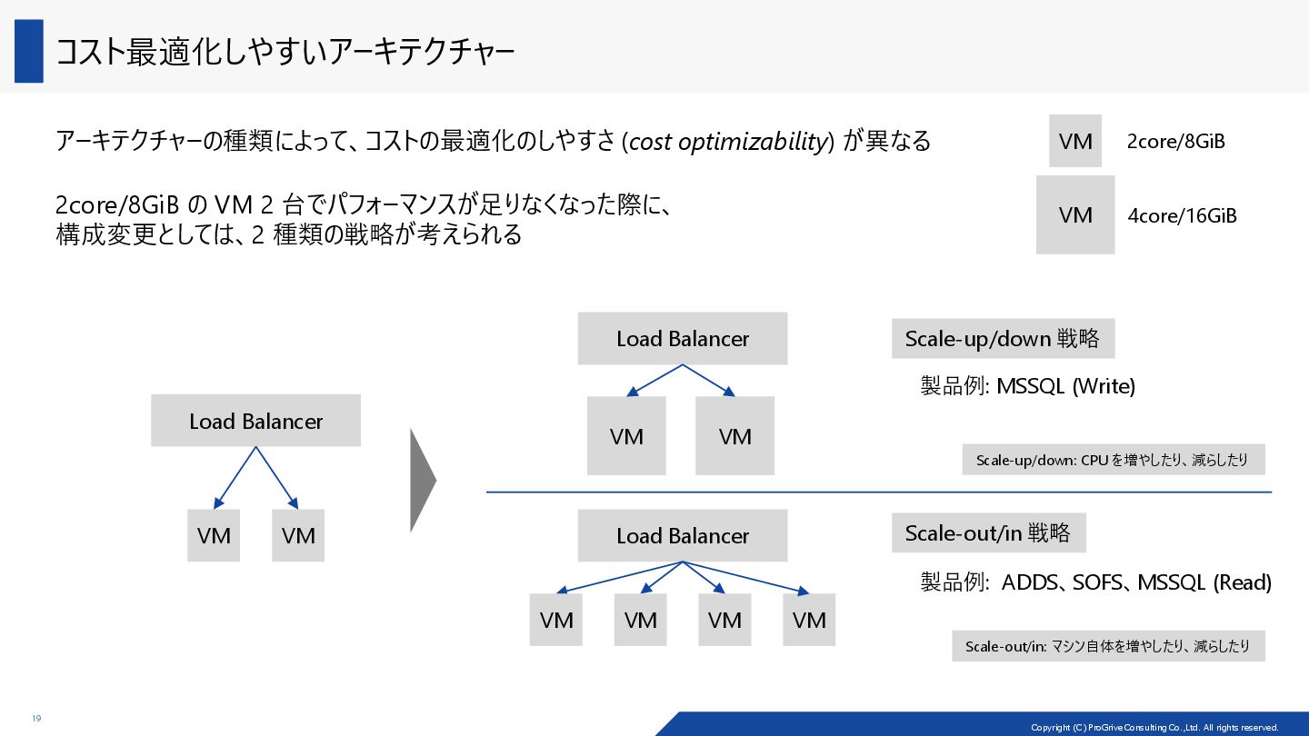 アーキテクチャーの種類によって、コストの最適化のしやすさ (cost optimizability) が異なる Load Balancer VM VM Load Balancer VM VM Load Balancer VM VM VM VM Scale-up/down 戦略 Scale-out/in 戦略 VM 2core/8GiB VM 4core/16GiB 2core/8GiB の VM 2 台でパフォーマンスが足りなくなった際に、 構成変更としては、2 種類の戦略が考えられる 製品例: ADDS、SOFS、MSSQL (Read) 製品例: MSSQL (Write) Scale-out/in: マシン自体を増やしたり、減らしたり Scale-up/down: CPU を増やしたり、減らしたり