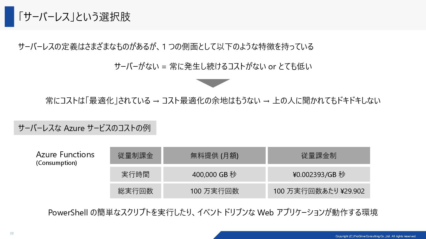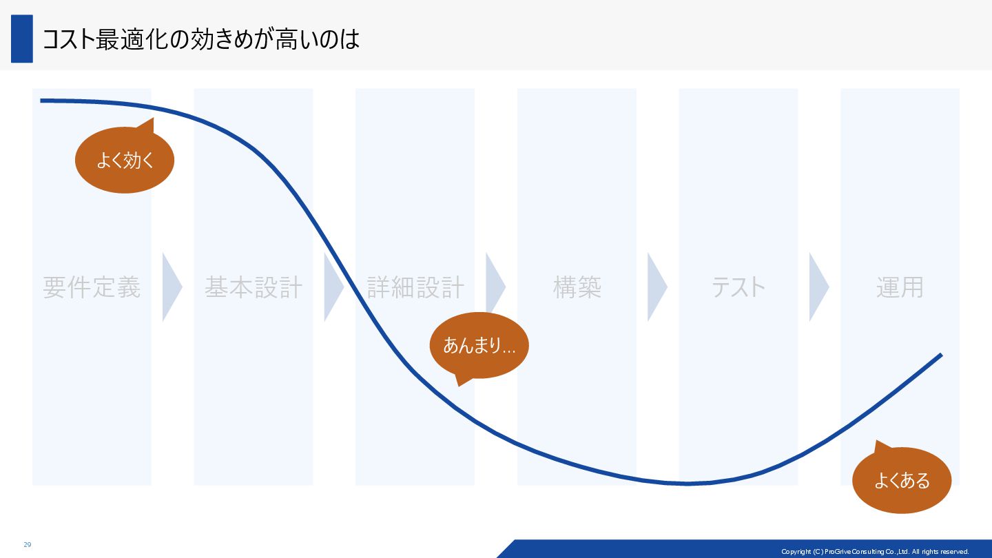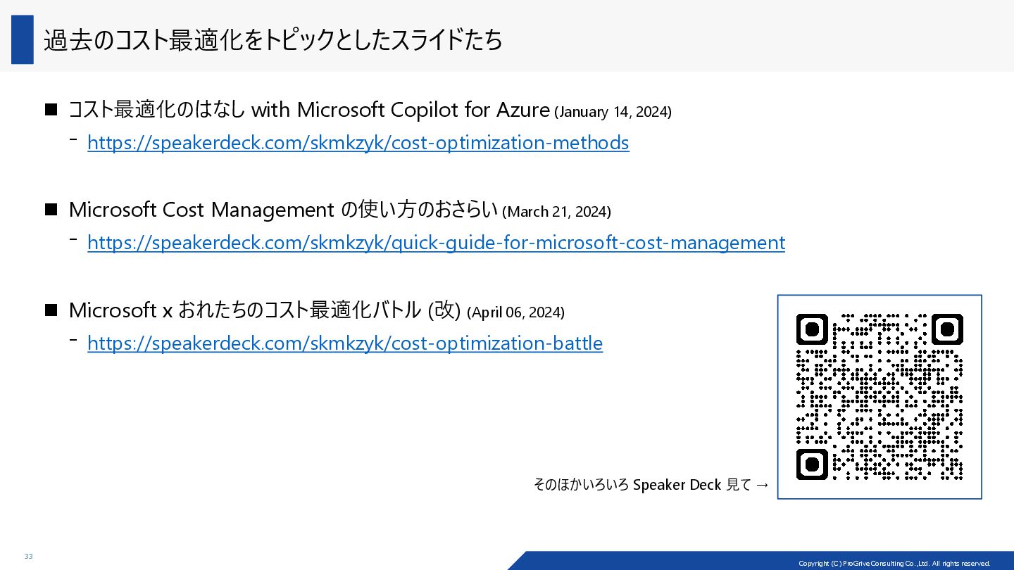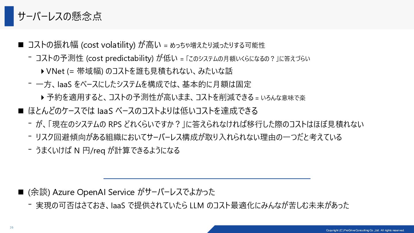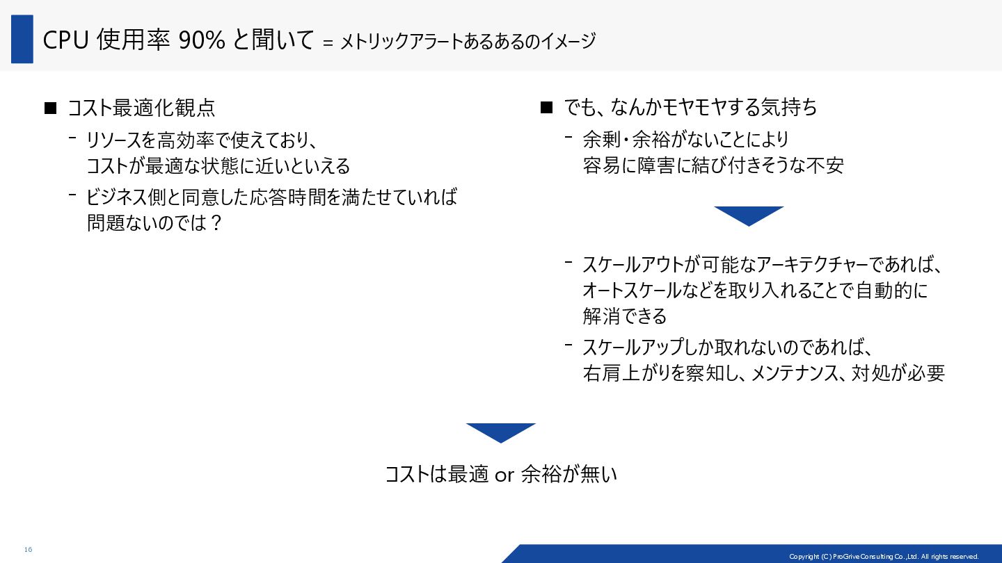 アーキテクチャーの種類によって、コストの最適化のしやすさ (cost optimizability) が異なる Load Balancer VM VM Load Balancer VM VM Load Balancer VM VM VM VM Scale-up/down 戦略 Scale-out/in 戦略 VM 2core/8GiB VM 4core/16GiB 2core/8GiB の VM 2 台でパフォーマンスが足りなくなった際に、 構成変更としては、2 種類の戦略が考えられる 製品例: ADDS、SOFS、MSSQL (Read) 製品例: MSSQL (Write) Scale-out/in: マシン自体を増やしたり、減らしたり Scale-up/down: CPU を増やしたり、減らしたり