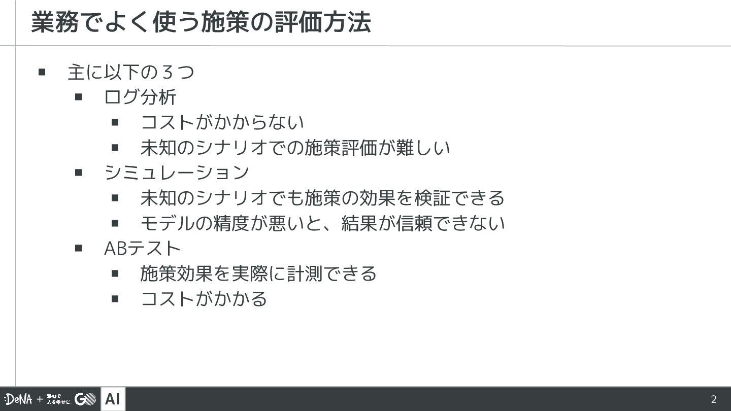 AI 2 ▪ 主に以下の3つ ▪ ログ分析 ▪ コストがかからない ▪ 未知のシナリオでの施策評価が難しい