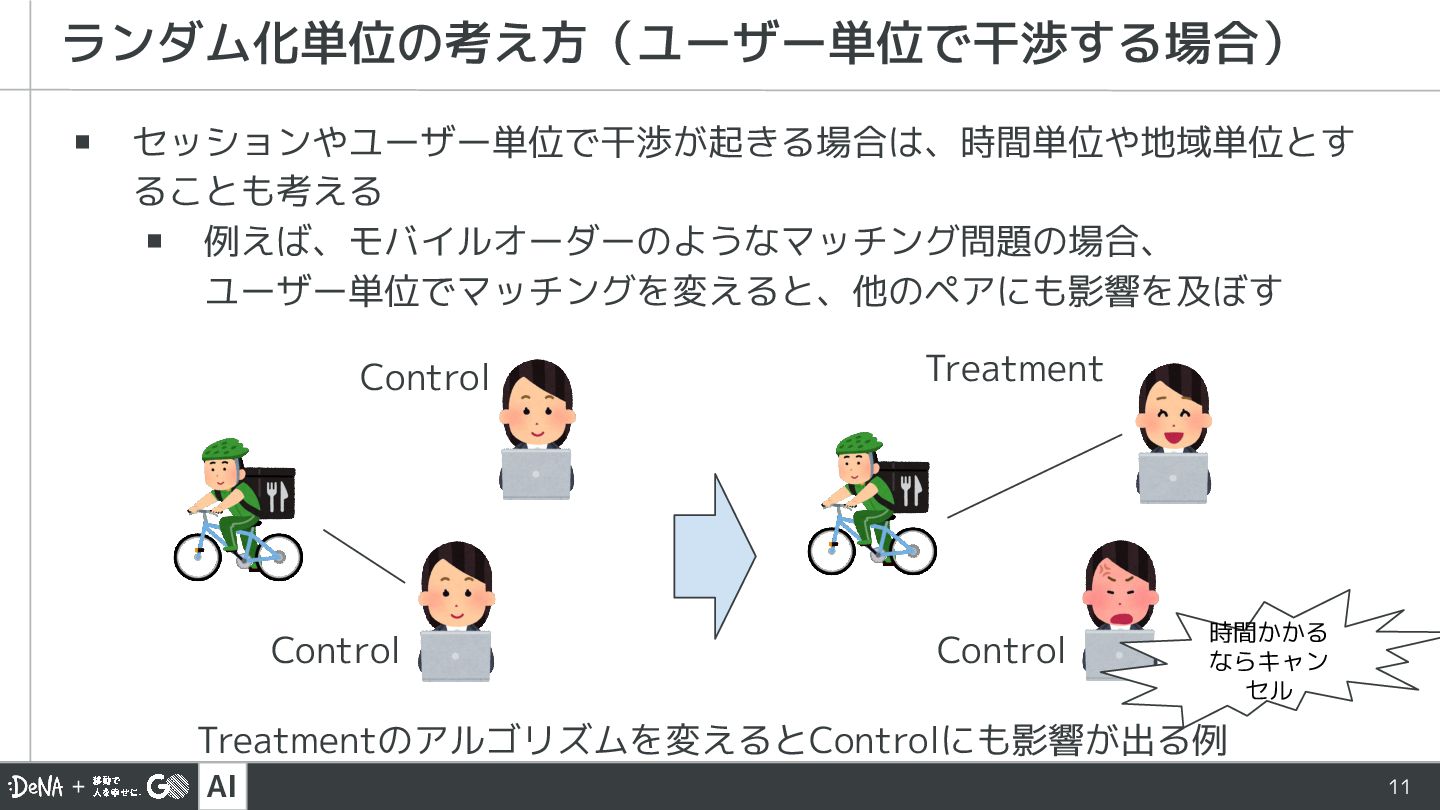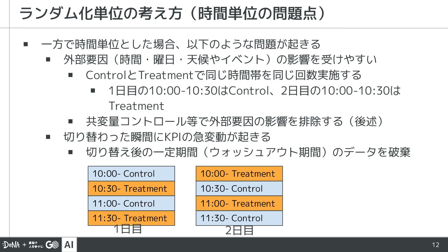 AI 11 ▪ セッションやユーザー単位で干渉が起きる場合は、時間単位や地域単位とす ることも考える ▪ 例えば、モバイルオーダーのようなマッチング問題の場合、 ユーザー単位でマッチングを変えると、他のペアにも影響を及ぼす ランダム化単位の考え方(ユーザー単位で干渉する場合) Control