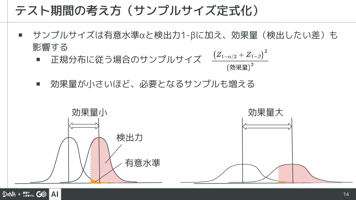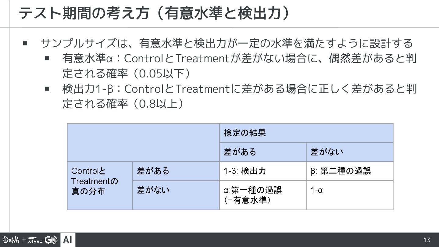 AI 13 ▪ サンプルサイズは、有意水準と検出力が一定の水準を満たすように設計する ▪ 有意水準α:ControlとTreatmentが差がない場合に、偶然差があると判 定される確率(0.05以下) ▪ 検出力1-β:ControlとTreatmentに差がある場合に正しく差があると判 定される確率(0.8以上)