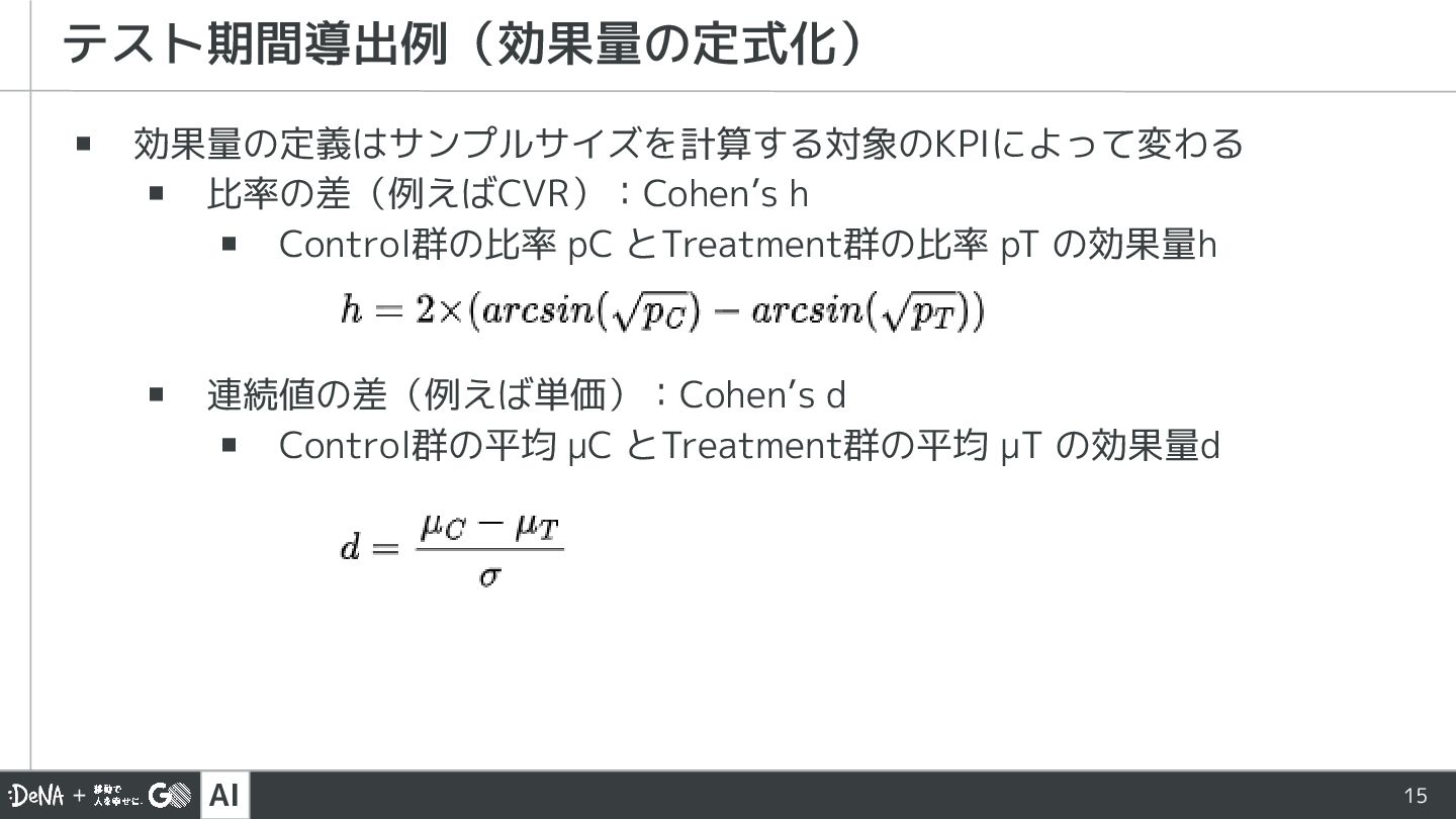 とTreatment群の比率 pT の効果量h ▪ 連続値の差(例えば単価):Cohen’s d ▪ Control群の平均 μC とTreatment群の平均 μT の効果量d テスト期間導出例(効果量の定式化)