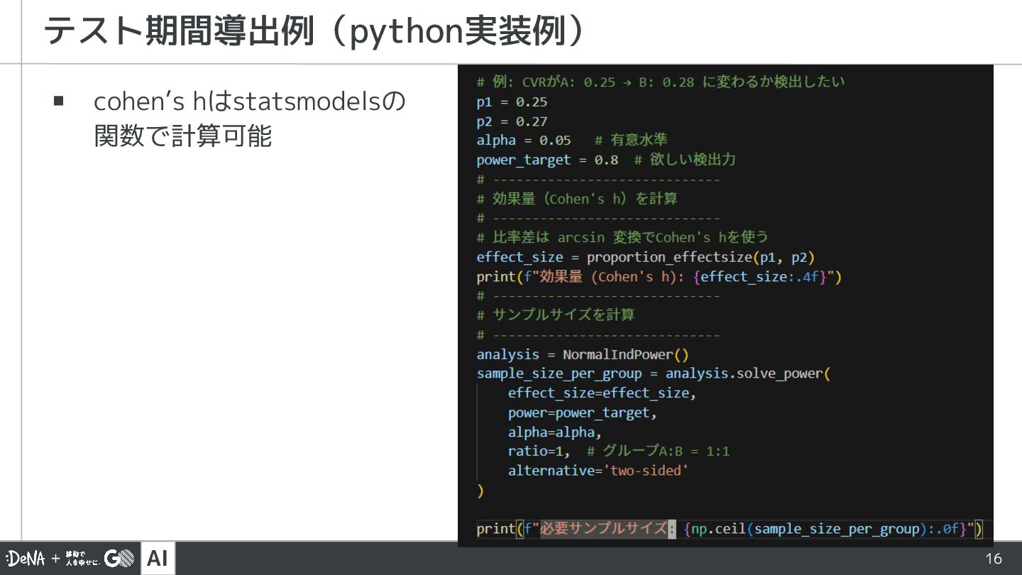 AI 16 ▪ cohen’s hはstatsmodelsの 関数で計算可能 テスト期間導出例(python実装例)
