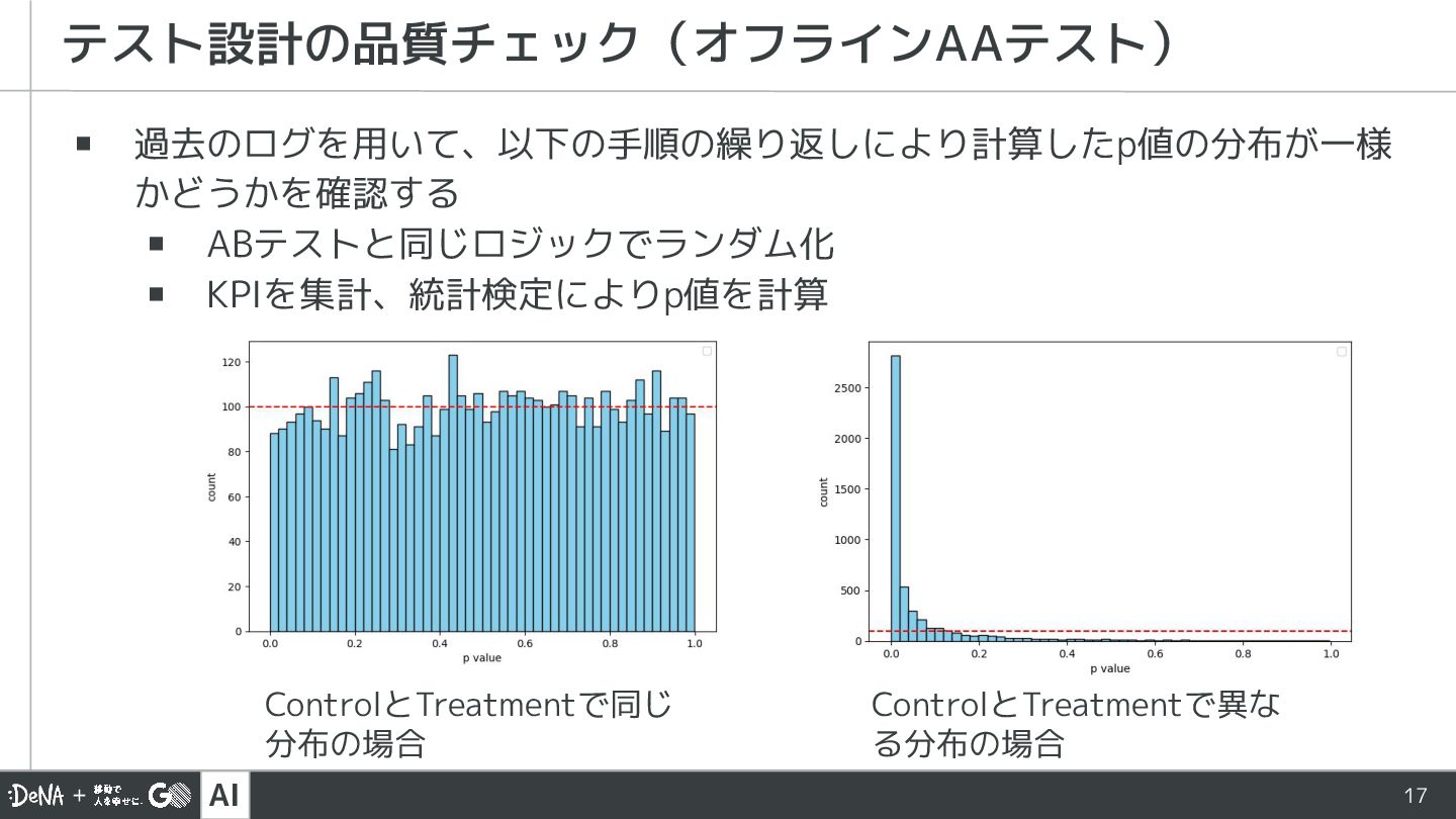 AI 17 ▪ 過去のログを用いて、以下の手順の繰り返しにより計算したp値の分布が一様 かどうかを確認する ▪ ABテストと同じロジックでランダム化 ▪ KPIを集計、統計検定によりp値を計算 テスト設計の品質チェック(オフラインAAテスト)
