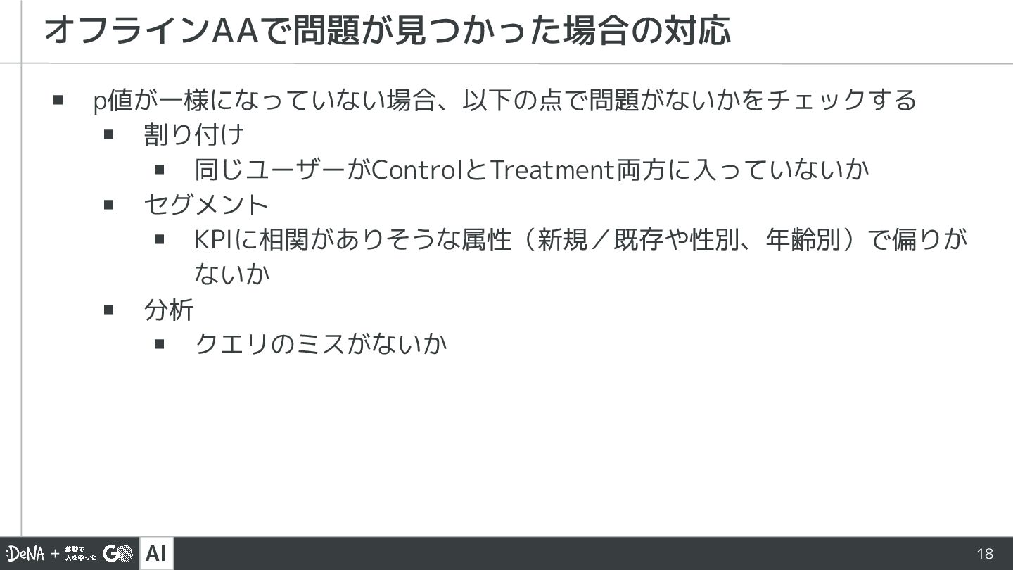 AI 18 ▪ p値が一様になっていない場合、以下の点で問題がないかをチェックする ▪ 割り付け ▪ 同じユーザーがControlとTreatment両方に入っていないか ▪ セグメント