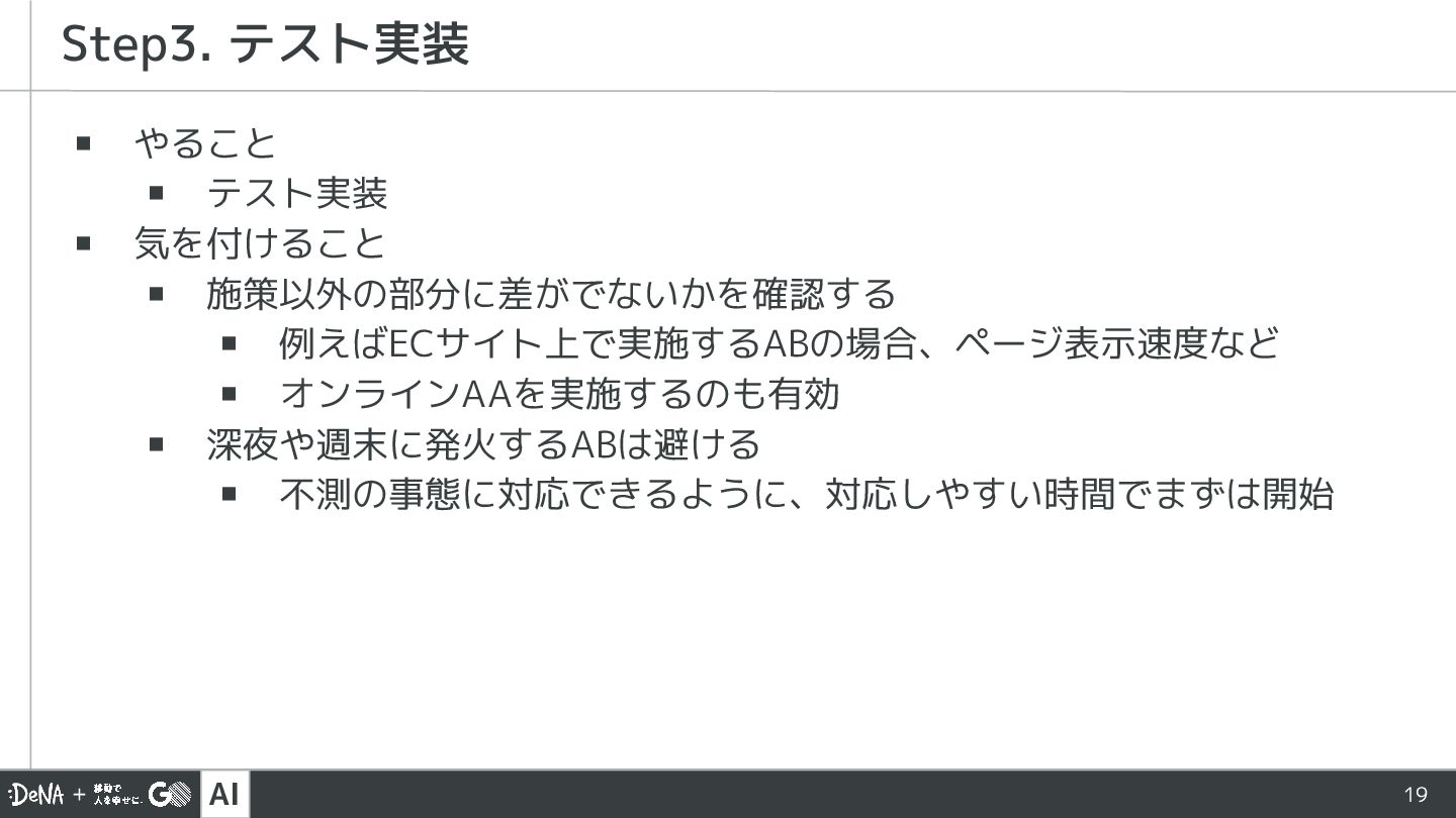 ▪ 例えばECサイト上で実施するABの場合、ページ表示速度など ▪ オンラインAAを実施するのも有効 ▪ 深夜や週末に発火するABは避ける ▪ 不測の事態に対応できるように、対応しやすい時間でまずは開始 Step3. テスト実装