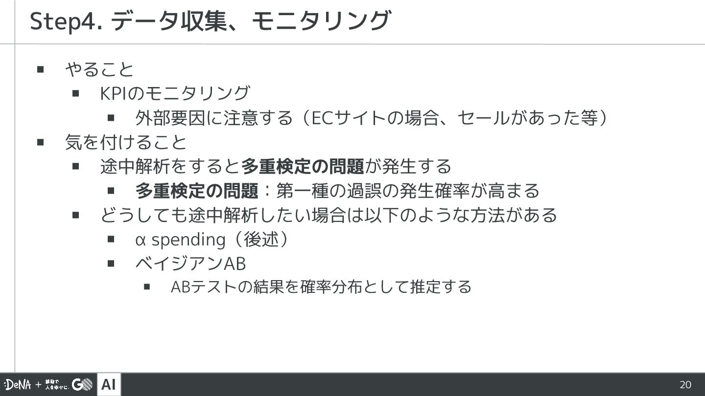 ▪ 途中解析をすると多重検定の問題が発生する ▪ 多重検定の問題:第一種の過誤の発生確率が高まる ▪ どうしても途中解析したい場合は以下のような方法がある ▪ α spending(後述) ▪ ベイジアンAB ▪ ABテストの結果を確率分布として推定する Step4. データ収集、モニタリング