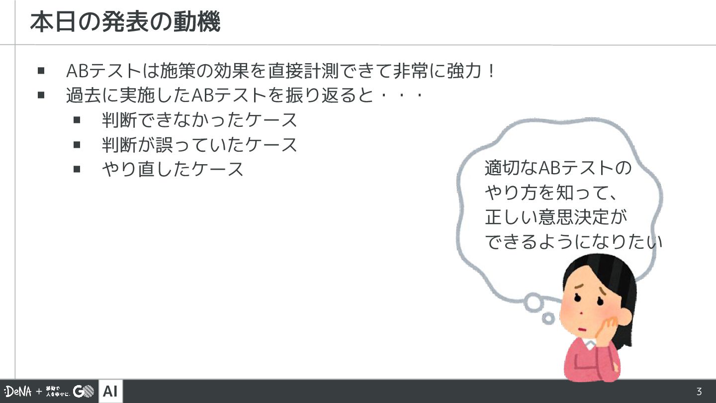AI 3 ▪ ABテストは施策の効果を直接計測できて非常に強力! ▪ 過去に実施したABテストを振り返ると・・・ ▪ 判断できなかったケース ▪ 判断が誤っていたケース