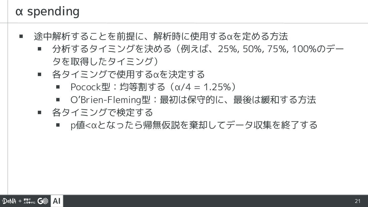 AI 21 ▪ 途中解析することを前提に、解析時に使用するαを定める方法 ▪ 分析するタイミングを決める(例えば、25%, 50%, 75%, 100%のデー タを取得したタイミング)