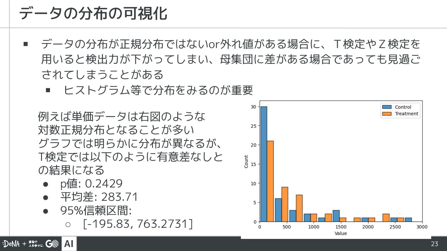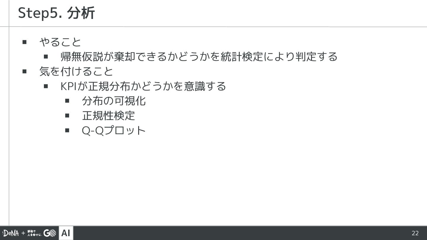 AI 22 ▪ やること ▪ 帰無仮説が棄却できるかどうかを統計検定により判定する ▪ 気を付けること ▪ KPIが正規分布かどうかを意識する