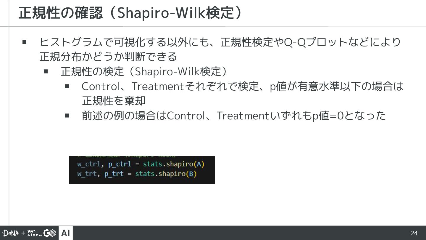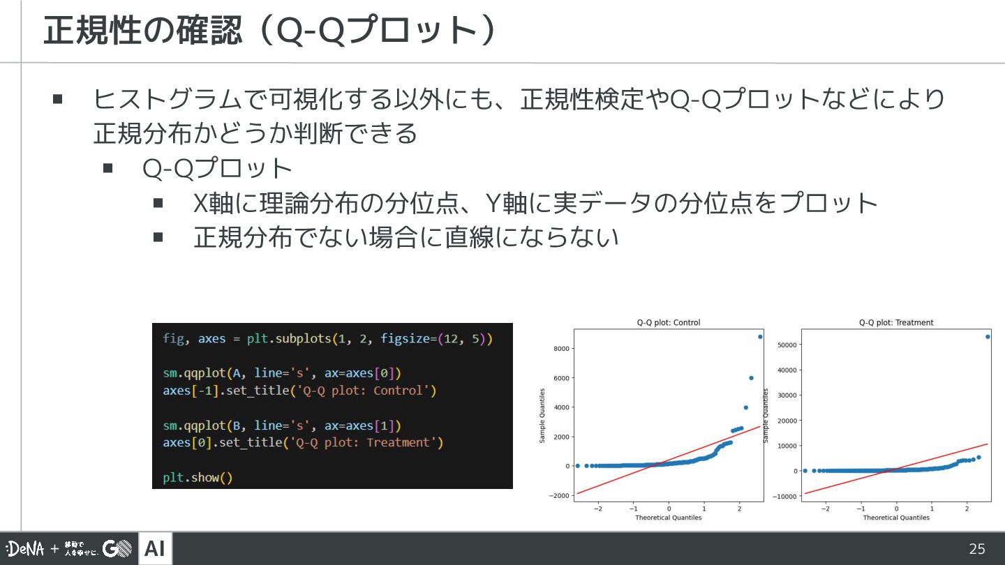 AI 24 ▪ ヒストグラムで可視化する以外にも、正規性検定やQ-Qプロットなどにより 正規分布かどうか判断できる ▪ 正規性の検定(Shapiro-Wilk検定) ▪ Control、Treatmentそれぞれで検定、p値が有意水準以下の場合は 正規性を棄却