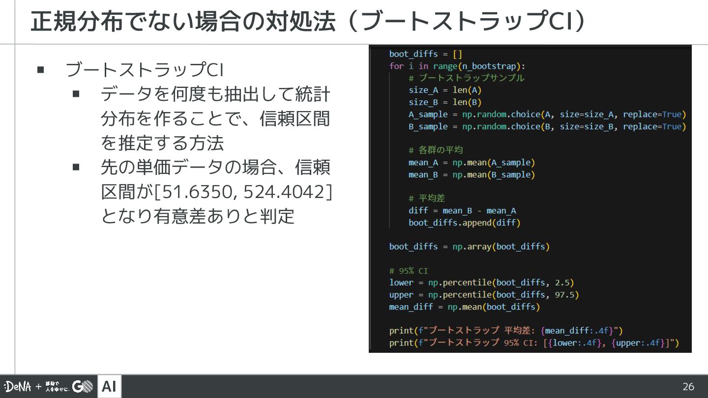 AI 26 ▪ ブートストラップCI ▪ データを何度も抽出して統計 分布を作ることで、信頼区間 を推定する方法 ▪ 先の単価データの場合、信頼