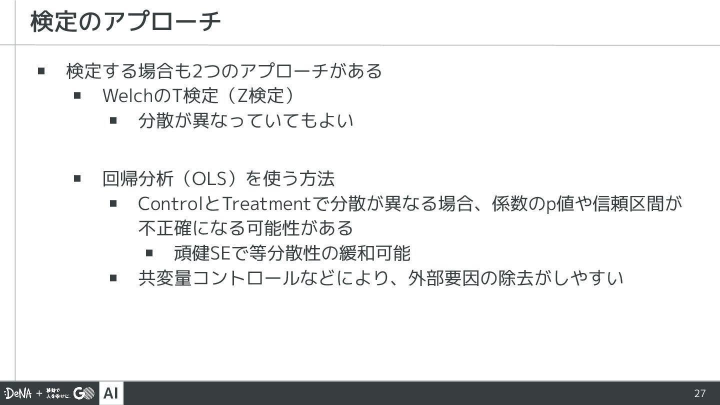 AI 27 ▪ 検定する場合も2つのアプローチがある ▪ WelchのT検定(Z検定) ▪ 分散が異なっていてもよい ▪ 回帰分析(OLS)を使う方法