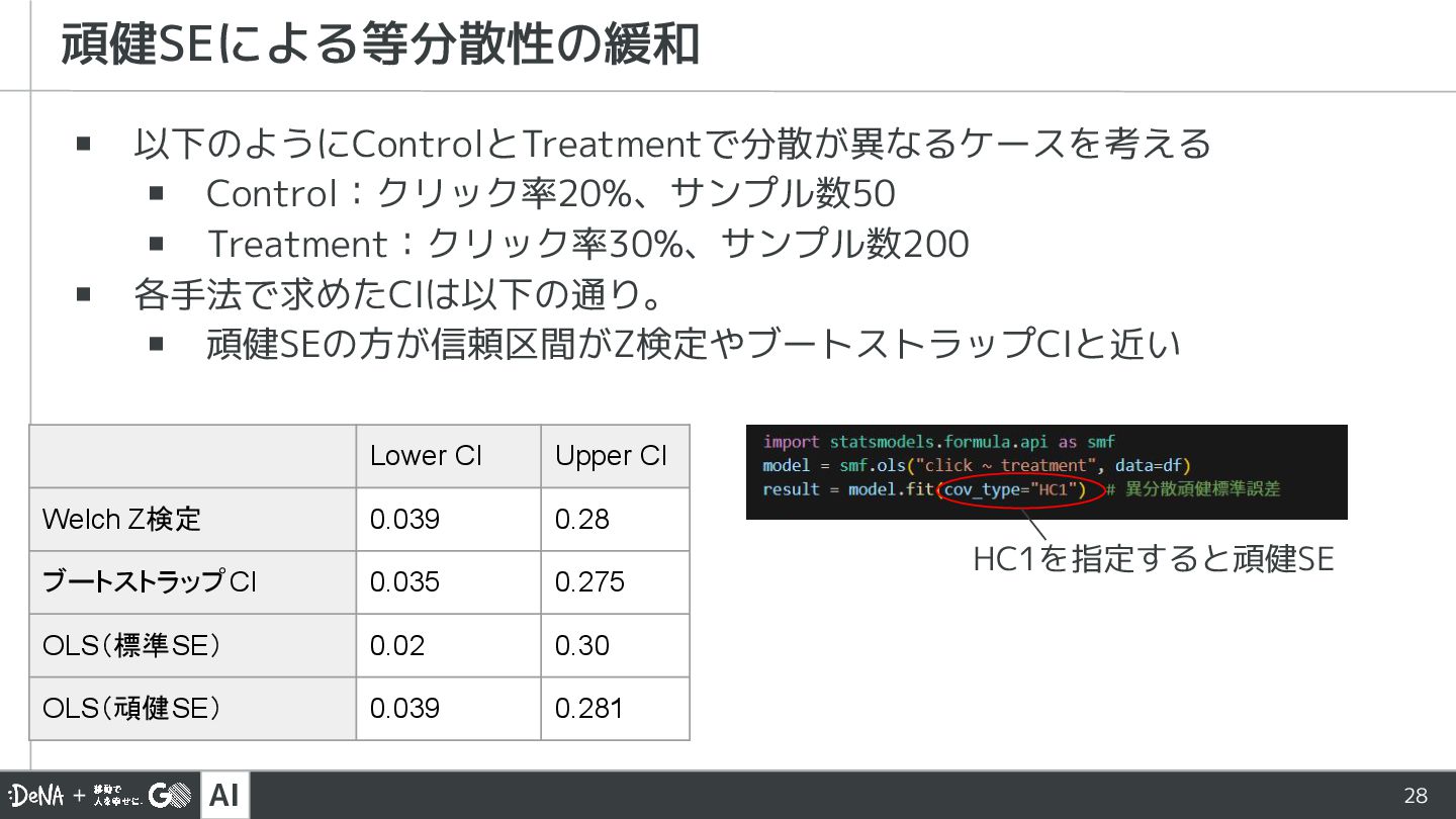 ▪ 頑健SEの方が信頼区間がZ検定やブートストラップCIと近い 頑健SEによる等分散性の緩和 Lower CI Upper CI Welch Z検定 0.039 0.28 ブートストラップCI 0.035 0.275 OLS(標準SE) 0.02 0.30 OLS(頑健SE) 0.039 0.281 HC1を指定すると頑健SE