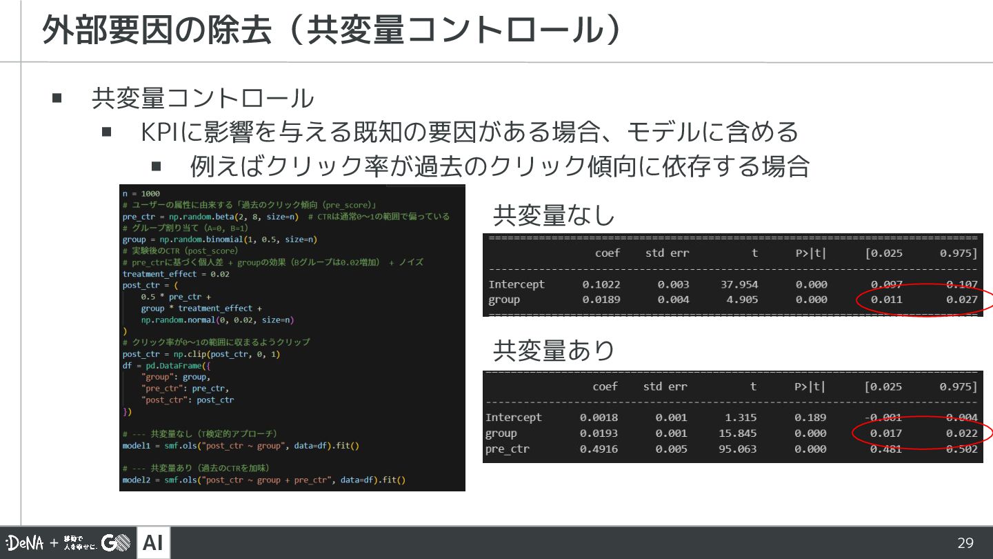 AI 29 ▪ 共変量コントロール ▪ KPIに影響を与える既知の要因がある場合、モデルに含める ▪ 例えばクリック率が過去のクリック傾向に依存する場合 外部要因の除去(共変量コントロール) 共変量あり